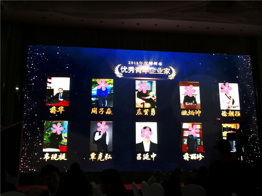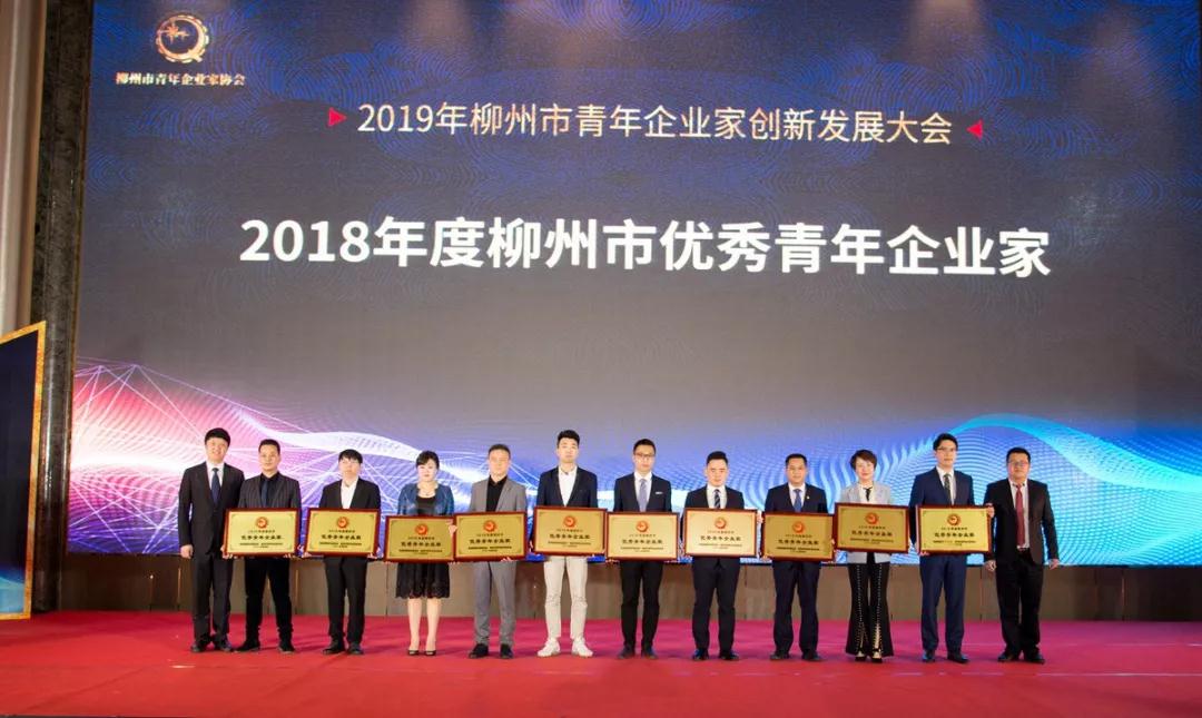 ▲團(tuán)市委書(shū)記張閏、副書(shū)記段志高為2018年度柳州市優(yōu)秀青年企業(yè)家頒獎(jiǎng)(右四為蔣華)