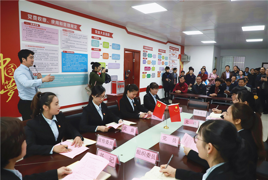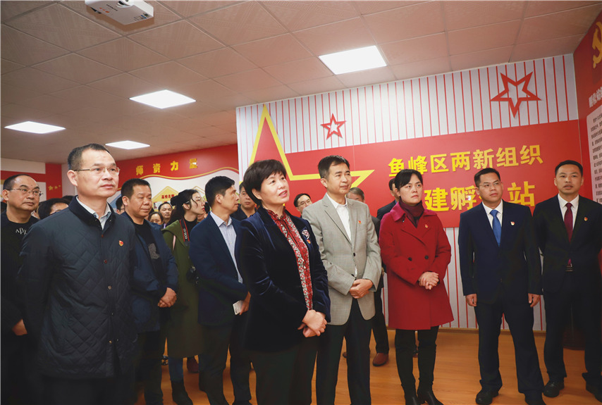 揭牌儀式前,由魚峰區(qū)委組織部副部長唐旭為全體人員講解了魚峰區(qū)兩新組織黨建孵化站的六大主題功能室,并現(xiàn)場觀摩了“三會一課”的實操演練。