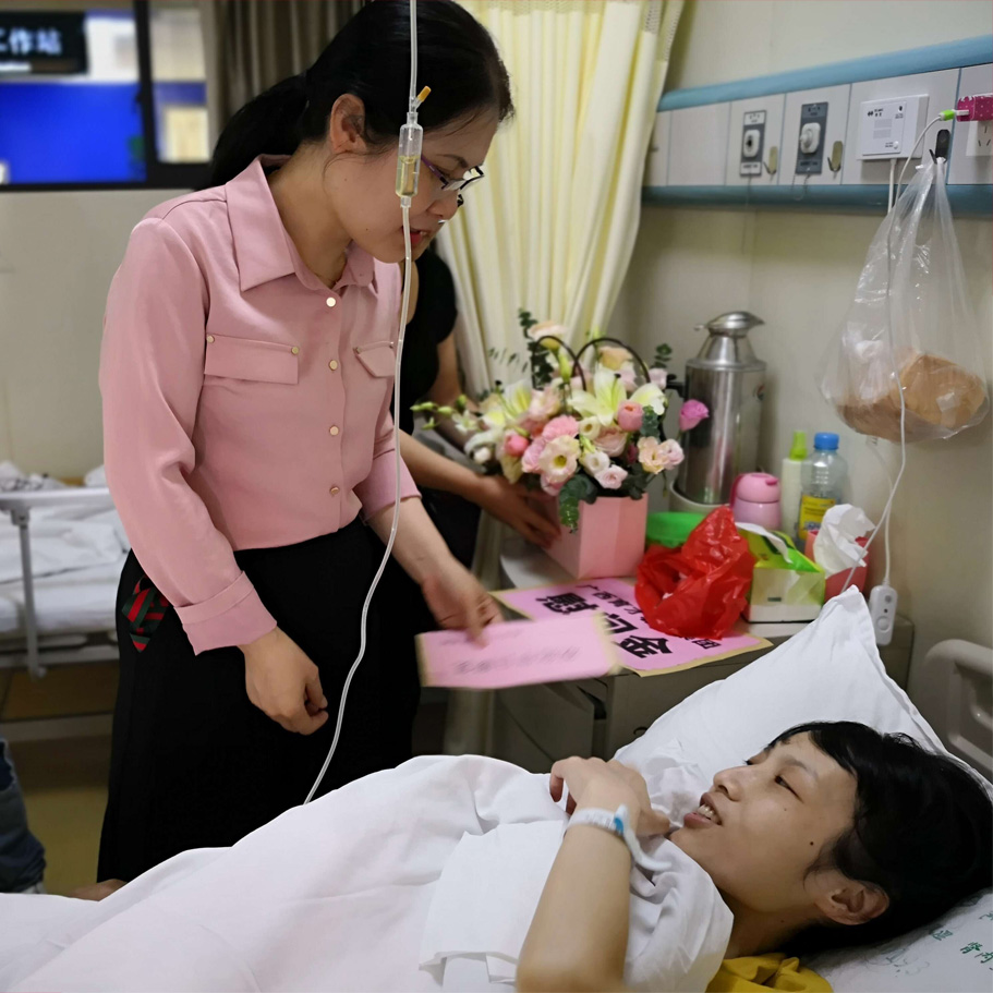 ▲李彩梅副校長(zhǎng)細(xì)心詢問(wèn)覃媛媛老師的病情和治療情況,鼓勵(lì)她要樹立信心,積極配合治療,爭(zhēng)取早日康復(fù)