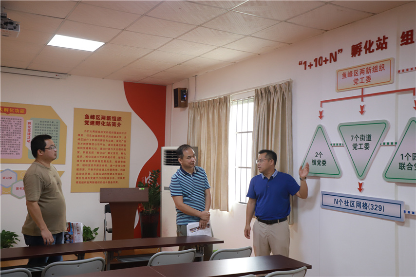 ▲城中區(qū)總工會黨組書記、副主席全偉誠(中)、副主席駱鈺(左一)參觀孵化站建設(shè)