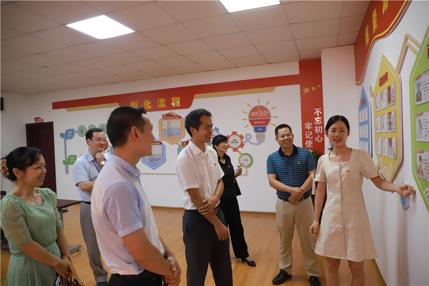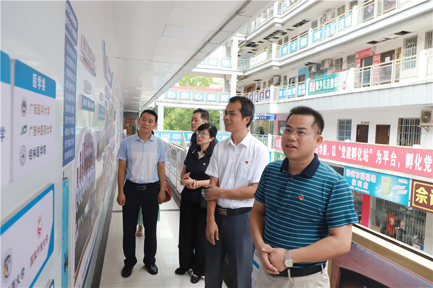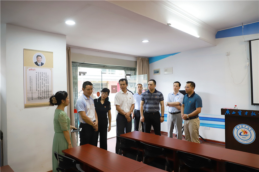 ▲廣西大學馬克思主義學院黨委書記周瑞超(中)、副處級組織員冷相宜(右三)、魚峰區(qū)委組織部副部長于俊發(fā)(左三)了解孵化站師資力量