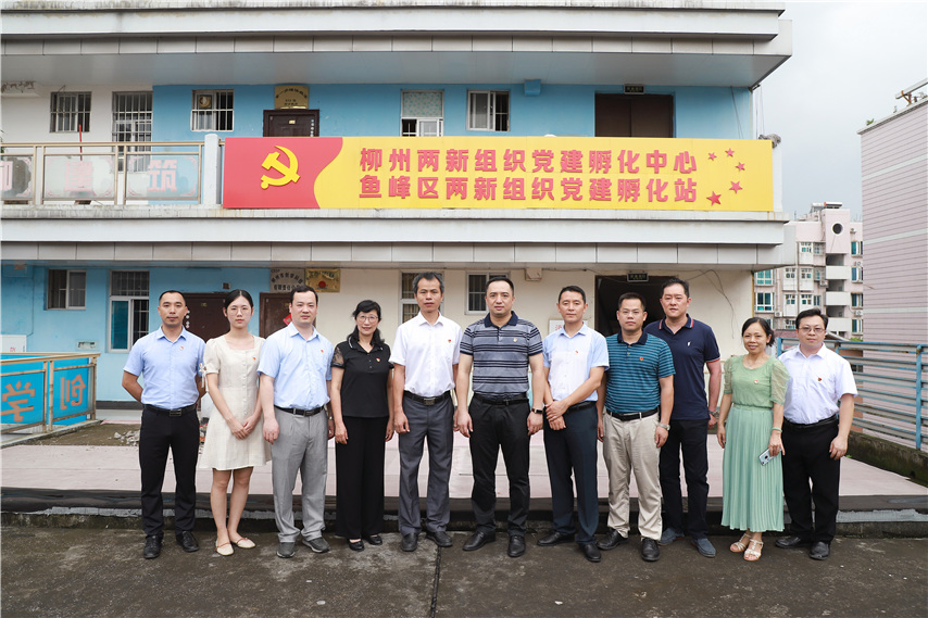 ▲廣西大學馬克思主義學院黨委書記周瑞超(左四)、副處級組織員冷相宜(左三)、柳州市委組織部組織四科科長池福波(右三)、魚峰區(qū)委組織部副部長于俊發(fā)(左二)參觀孵化站建設