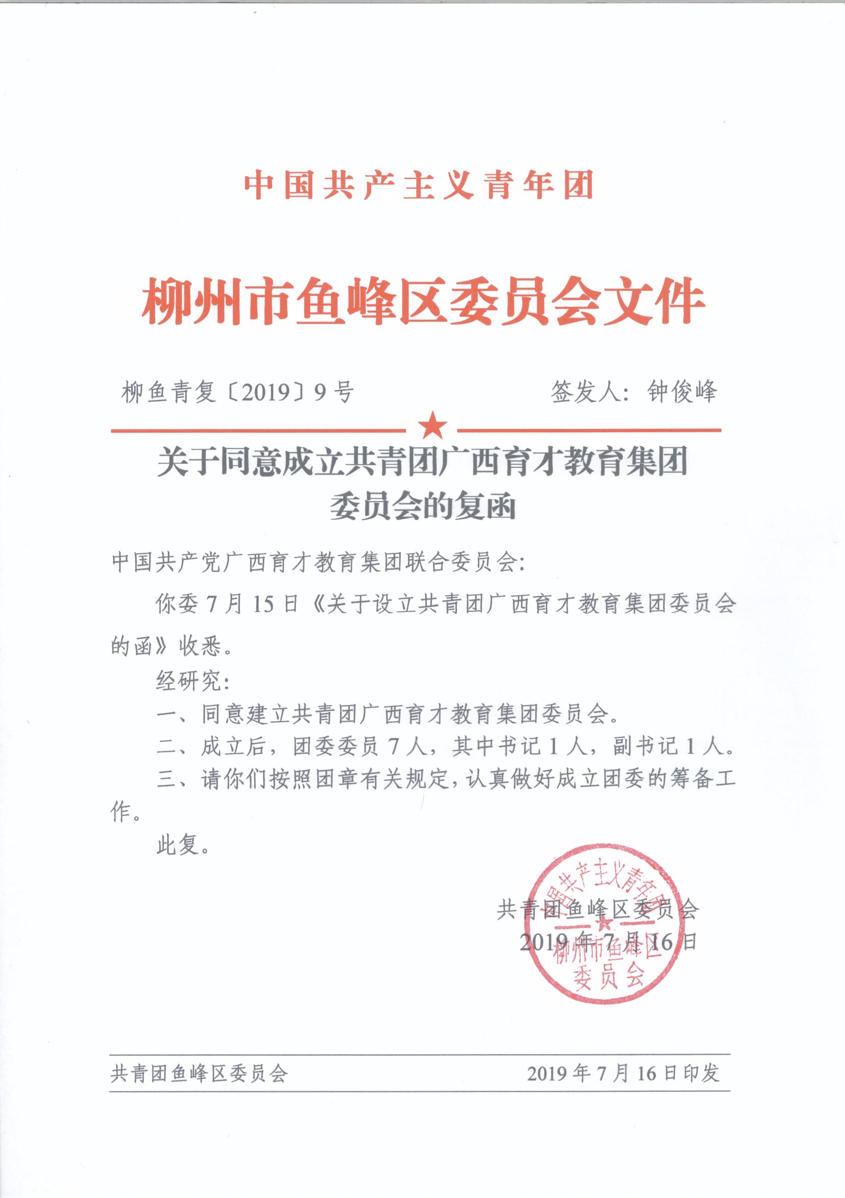 ▲共青團(tuán)魚峰區(qū)委員會(huì)《關(guān)于同意成立共青團(tuán)廣西育才教育集團(tuán)委員會(huì)的批復(fù)》