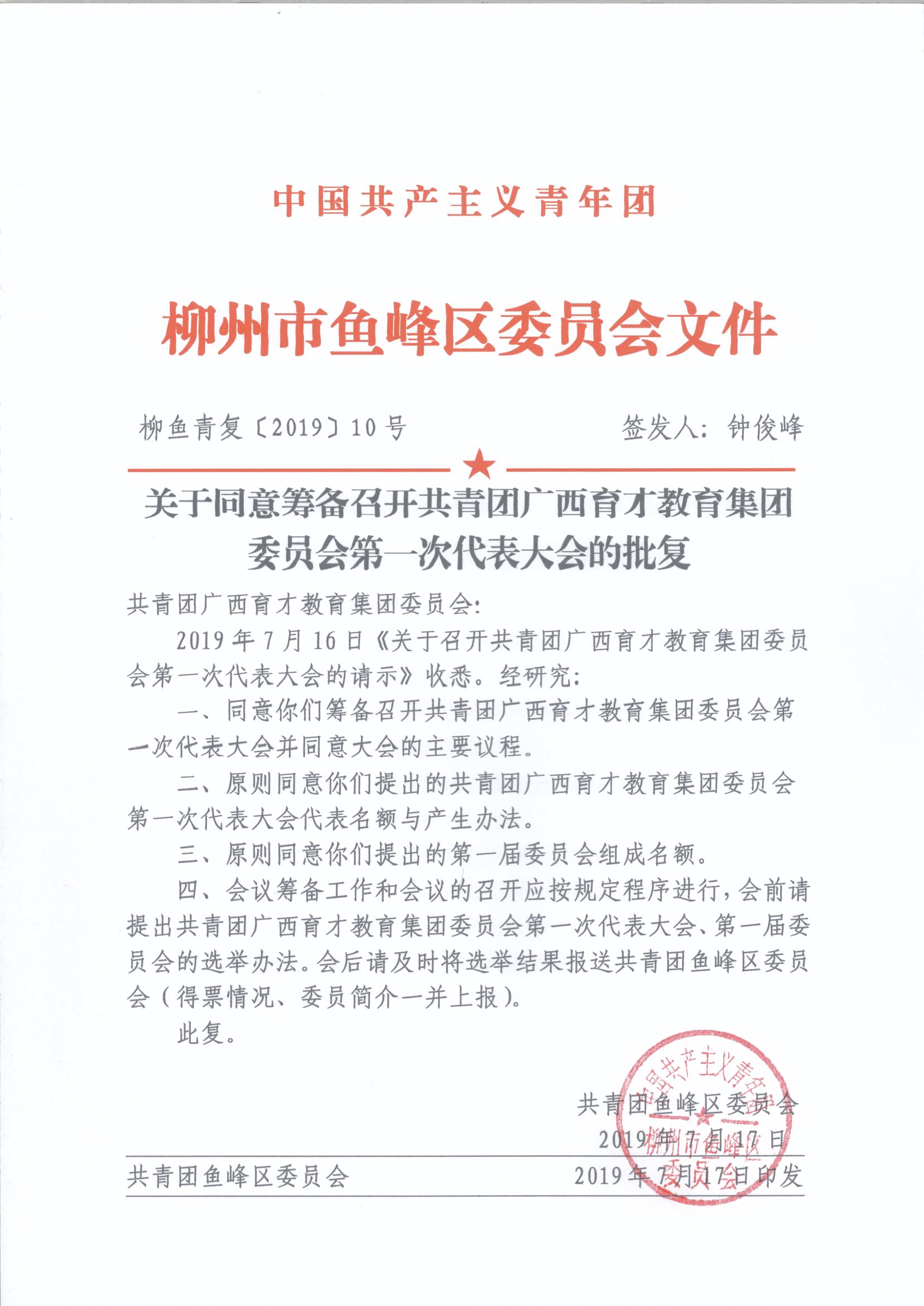 ▲共青團(tuán)魚峰區(qū)委員會(huì)《關(guān)于同意籌備召開共青團(tuán)廣西育才教育集團(tuán)委員會(huì)第一次代表大會(huì)的批復(fù)》