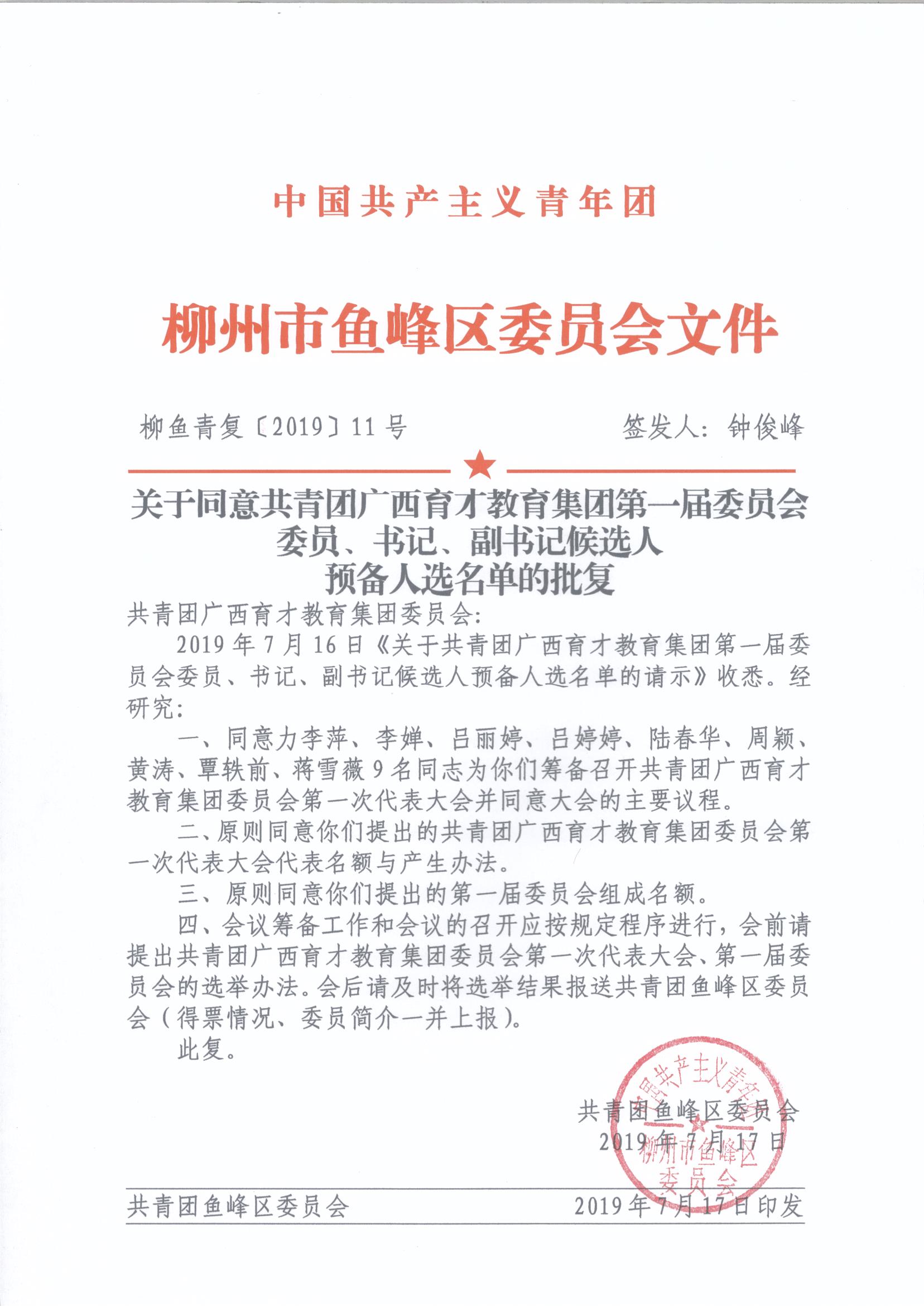 ▲共青團(tuán)魚峰區(qū)委員會(huì)《關(guān)于同意共青團(tuán)廣西育才教育集團(tuán)第一屆委員會(huì)委員、書記、副書記候選人預(yù)備人選名單的批復(fù)》
