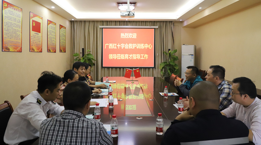 11月5日,廣西紅十?字會救護(hù)訓(xùn)練中心主任?何國?杰、廣西紅十字基金會項目部部長覃超蕓、救護(hù)訓(xùn)練中心主?任助?理饒斐、救?護(hù)訓(xùn)?練中心柳?州工作站站長張郁?林一行蒞臨育才考察指導(dǎo),集團(tuán)聯(lián)合黨委書記、董事長蔣華,聯(lián)合黨委委員、培訓(xùn)學(xué)院副院長趙彬陪同考察座談。