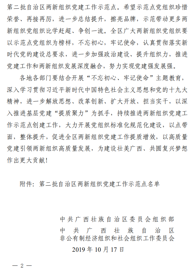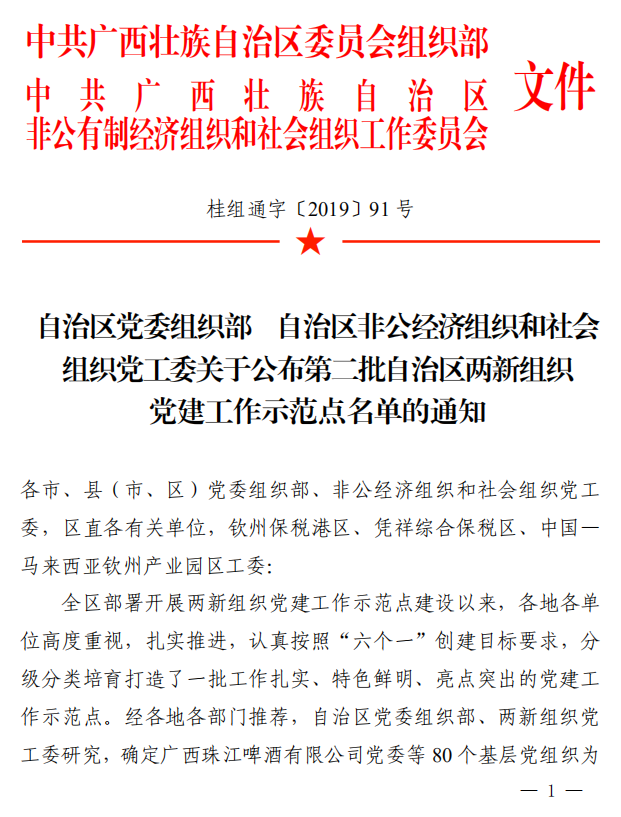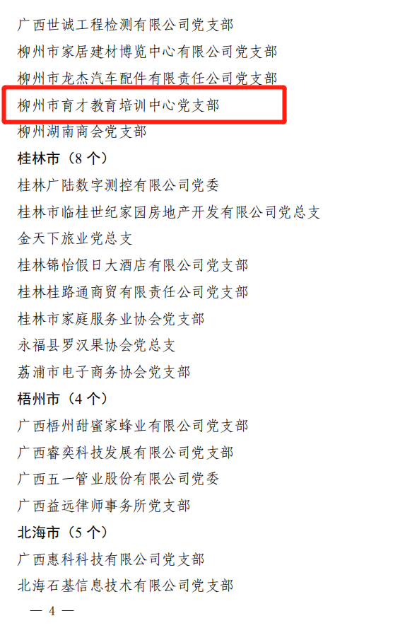 近日,廣西下發(fā)《自治區(qū)黨委組織部 自治區(qū)非公經(jīng)濟(jì)組織和社會(huì)組織黨工委關(guān)于公布第二批自治區(qū)兩新組織黨建工作示范點(diǎn)名單的通知》。經(jīng)各地各部門(mén)推薦,自治區(qū)黨委組織部、兩新組織黨工委研究,確定80個(gè)非公企業(yè)和社會(huì)組織黨組織基層黨組織為第二批自治區(qū)兩新組織黨建工作示范點(diǎn)。集團(tuán)聯(lián)合黨委下設(shè)的柳州市育才教育培訓(xùn)中心黨支部光榮上榜。