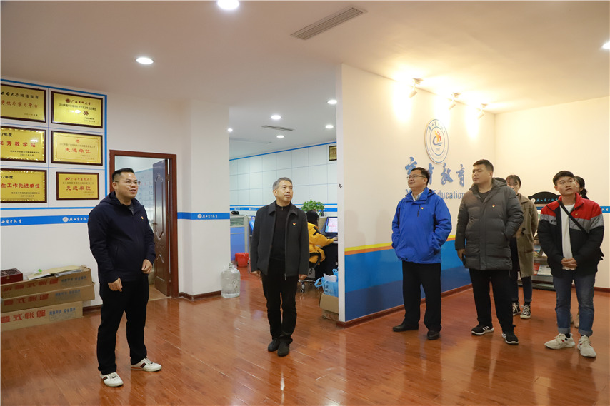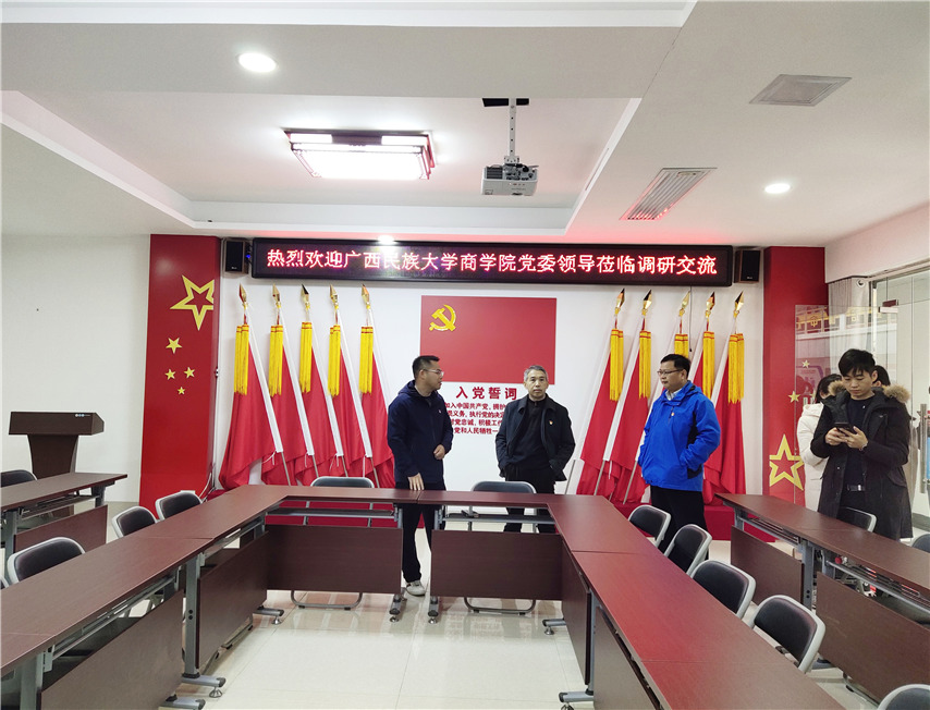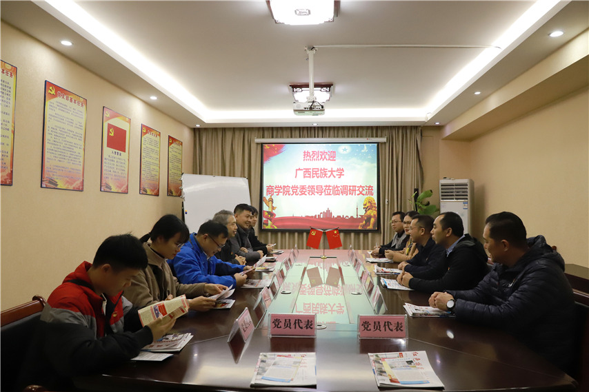 12月19日,廣西民族大學商學院黨委書記李華明,副書記曾令發(fā)、副院長高文濤、學生黨支部書記楊玉及四名學生黨員一行蒞臨集團柳?州本部調(diào)研交?流黨建工作,集團聯(lián)合黨委黨書記、董事長蔣華,聯(lián)合黨委紀檢委員、副校長李彩梅,聯(lián)合黨委委員、副校長蔣亮,聯(lián)合黨委委員、培訓學院副院長趙彬陪同交流。