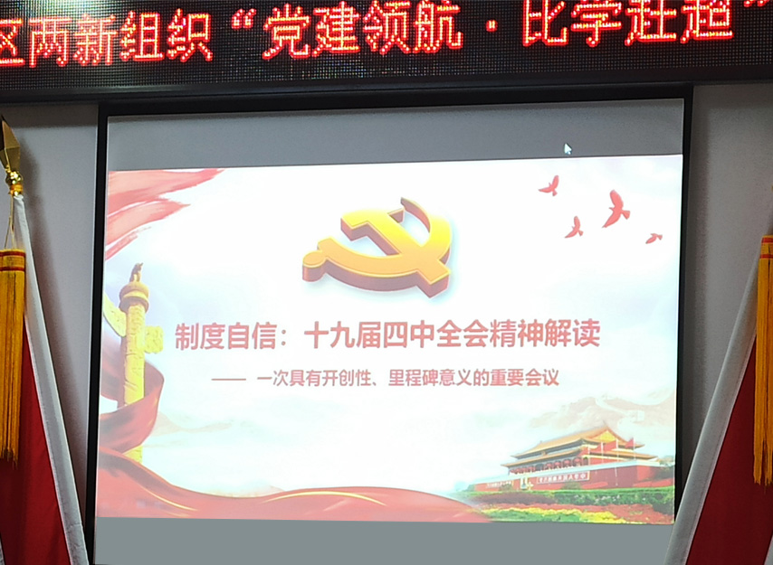 ▲柳州職業(yè)技術(shù)學(xué)院馬克思主義學(xué)院副院長藍(lán)星華副教授以《制度自信:十九屆四中全會精神解讀》為題,深入解讀了黨的十九屆四中全會精神,為新時代兩新組織如何在黨旗引領(lǐng)下凝心聚力謀發(fā)展理清了思路。