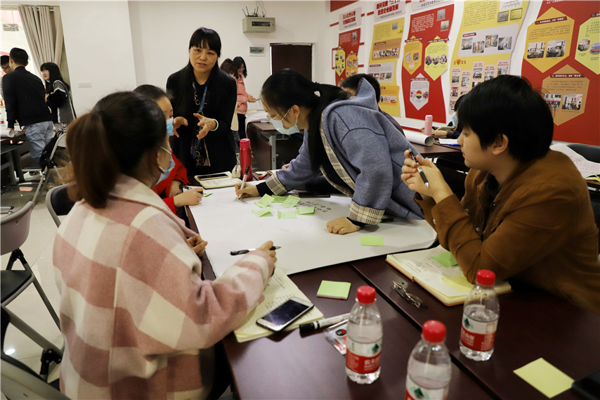 韋教授隨機(jī)將學(xué)員分成4個(gè)小組,各個(gè)小組圍桌而坐,大家一邊熱烈討論一邊把智慧“書寫”在紙上,解決問題的辦法,行動(dòng)對(duì)策,群策群力……一場(chǎng)“頭腦風(fēng)暴”正在進(jìn)行。