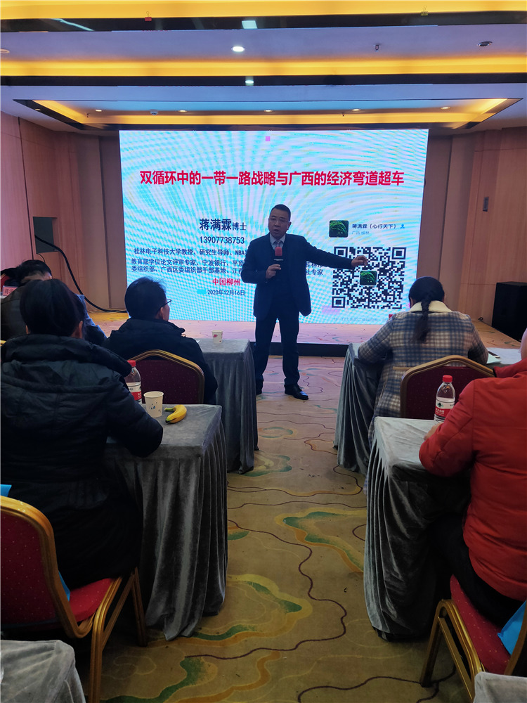 桂林電子科技大學(xué)教授、研究生導(dǎo)師蔣滿霖博士以《雙循環(huán)中的一帶一路戰(zhàn)略與廣西的經(jīng)濟(jì)彎道超車》從廣西自身優(yōu)勢(shì),以及當(dāng)前面臨的形勢(shì)等方面對(duì)其進(jìn)行分析,并對(duì)其發(fā)展提出可行性建議。