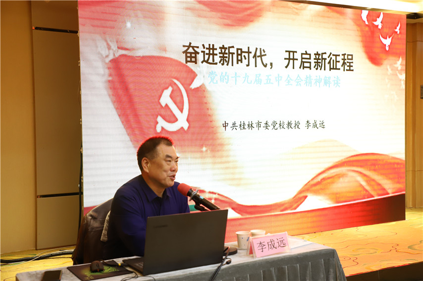 中共桂林市委黨校教授李成遠(yuǎn)以《奮進(jìn)新時(shí)代,開啟新征程》為題,對(duì)黨的