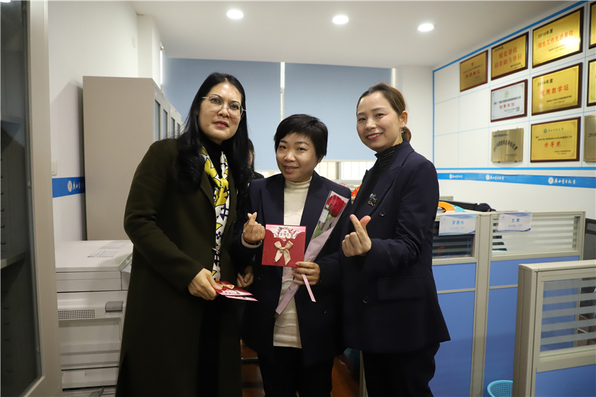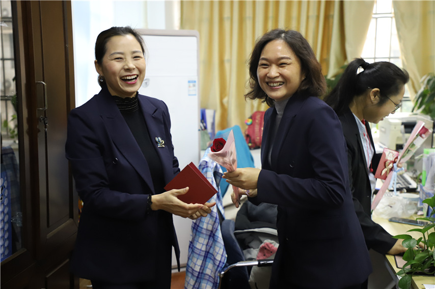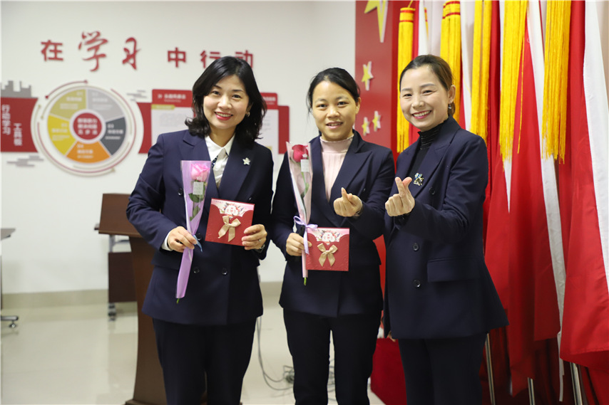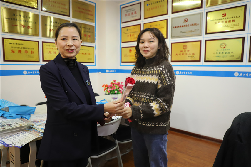 ▲柳州本部(集團(tuán)黨委委員、副總經(jīng)理、副校長(zhǎng)李彩梅,集團(tuán)黨委委員、工會(huì)主席、副總經(jīng)理、副校長(zhǎng)王麗為女職工贈(zèng)送玫瑰花)