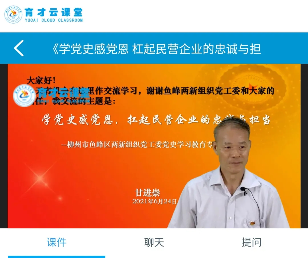 為推動兩新組織扎實(shí)開展黨史學(xué)習(xí)教育,提高兩新黨員黨性修養(yǎng),6月24日上午,魚峰區(qū)兩新組織黨工委運(yùn)用育才“云課堂”開展了2021年第二期云黨課,邀請高級政工師、魚峰區(qū)兩新名師甘進(jìn)崇為魚峰區(qū)兩新組織黨員干部上了一堂題為《學(xué)黨史感黨恩 杠起民營企業(yè)的忠誠與擔(dān)當(dāng)》的直播黨課。