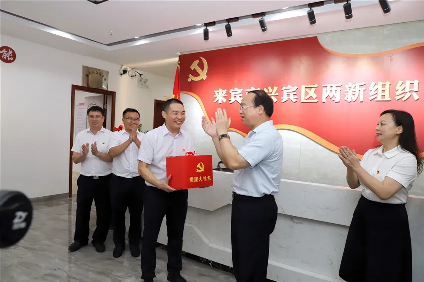 來賓市人大常委會副主任、興賓區(qū)區(qū)委書記周靈為興賓區(qū)兩新組織黨校校長羅祥雄贈送黨建大禮包。