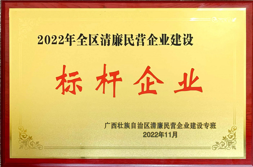 根據(jù)自治區(qū)黨委關(guān)于清廉廣西建設(shè)的部署要求,認(rèn)真落實(shí)清廉廣西建設(shè)工作現(xiàn)場(chǎng)推進(jìn)會(huì)精神,經(jīng)過培育創(chuàng)建、組織核驗(yàn)、推薦報(bào)送、審核等程序,且經(jīng)公示無異議,自治區(qū)清廉民營企業(yè)建設(shè)專班公布了2022年全區(qū)清廉民營企業(yè)建設(shè)標(biāo)桿企業(yè)名單(共111家),我集團(tuán)也是獲此殊榮的企業(yè)之一。會(huì)上,魚峰區(qū)政協(xié)副主席、工商聯(lián)主席戴翔為集團(tuán)授予自治區(qū)清廉民營企業(yè)建設(shè)標(biāo)桿企業(yè)榮譽(yù)獎(jiǎng)牌。