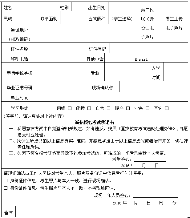 2.2016年重慶市成人高等教育本科生申請學(xué)士學(xué)位外語水平考試報(bào)名登記表(學(xué)生報(bào)考現(xiàn)場確認(rèn)樣表)