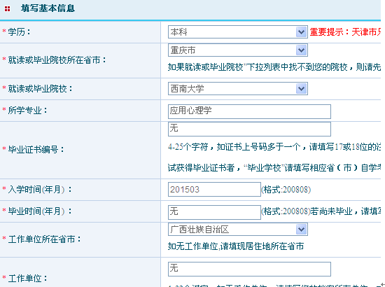 注意:填寫時(shí)學(xué)歷選擇本科,就讀院校所在省市選擇重慶市,工作單位所在省市選擇廣西壯族自治區(qū),其他的根據(jù)實(shí)際情況填寫。