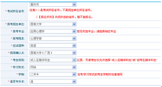 注意:考試所在的省選擇重慶市,報(bào)考單位選擇就讀的網(wǎng)院而不是學(xué)習(xí)中心,現(xiàn)場確認(rèn)點(diǎn)選擇西南大學(xué)(廣西)。