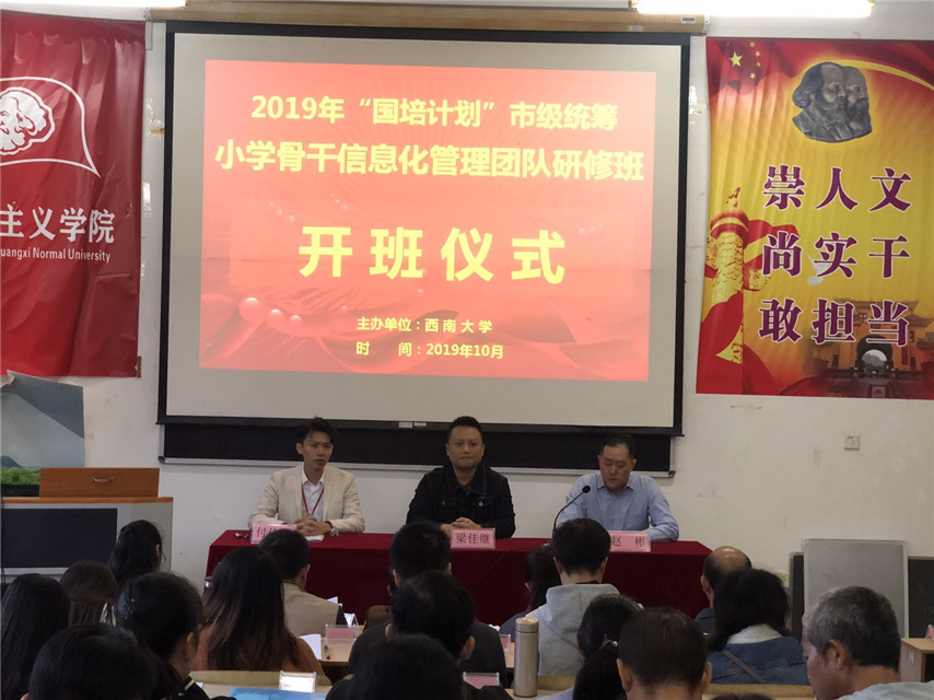 10月26日???,由西南大學網(wǎng)絡與繼續(xù)教育學院主辦、柳州市育才職業(yè)培訓學校承辦,為期10天的2019???年???“???國???????培???計???劃???”???市???????級???統(tǒng)???????籌??柳城縣、鹿寨縣小學骨干信息化管理團隊培訓班在???桂林順利???開???????班???,???柳州市教師培訓與學生素質(zhì)教育中心梁佳繼老師,集團聯(lián)合黨委委員、培訓學院副院長趙彬以及來?自?柳城、鹿寨的60余名小學教師???參???????加???了?培?訓?。