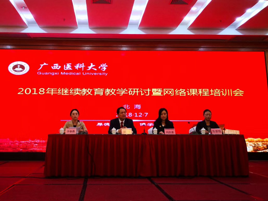 12月7日,廣西醫(yī)科大學2018年繼續(xù)教育教學研討暨網絡課程培訓會在北海隆重召開,廣西醫(yī)科大學繼續(xù)教育學院院長趙邦教授、副院長劉慶委、李春燕以及全區(qū)各衛(wèi)校校領導、教務教學管理人員參加了會議。會議由李春燕副院長主持。