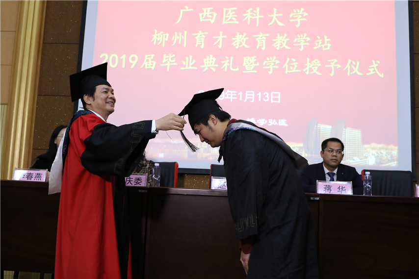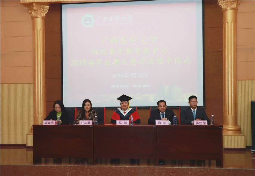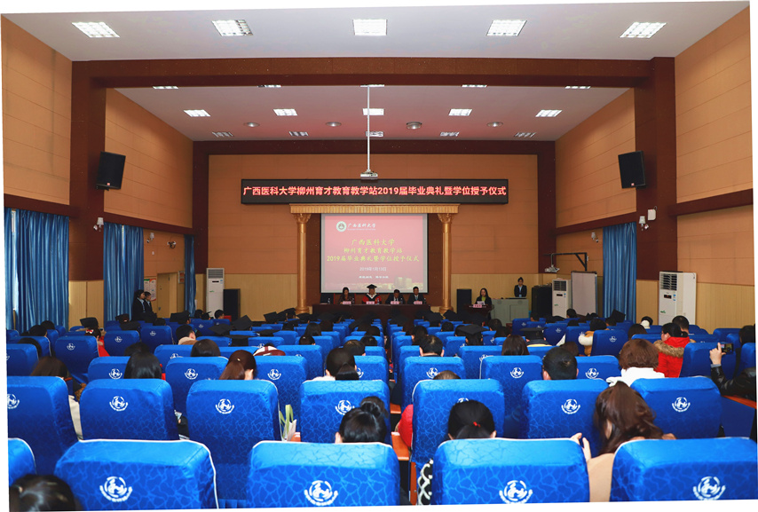 1月13日下午,廣西醫(yī)科大學育才教育教學站2019屆成高畢業(yè)典禮暨學位授予儀式在柳州本部隆重舉行。廣西醫(yī)科大學繼續(xù)教育學院院長、學位評定委員會委員、主任醫(yī)師趙邦教授、副院長劉慶委、李春燕、院辦主任黃明、教務科科長馮政毅、廣西育才教育黨總支書記、教學站站長蔣華、副站長蔣仕榮以及來自柳州醫(yī)學行業(yè)的200多名專本科畢業(yè)生代表參加了畢業(yè)典禮,典禮由副站長蔣仕榮主持。
