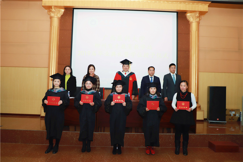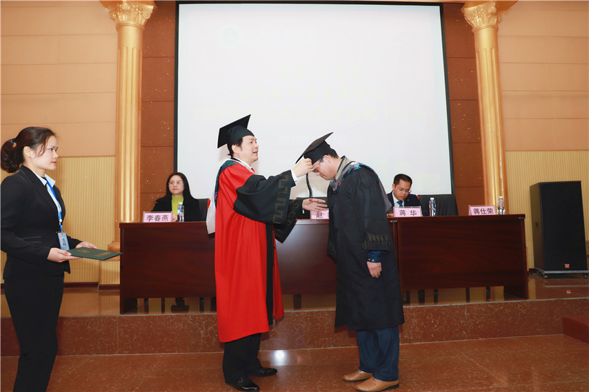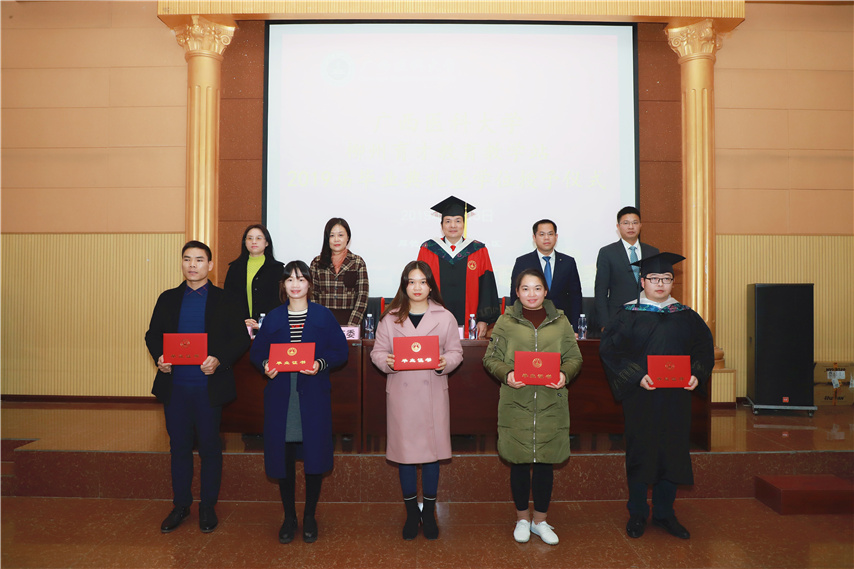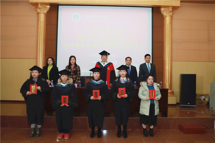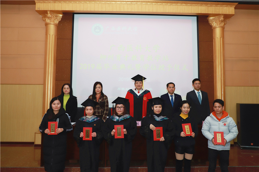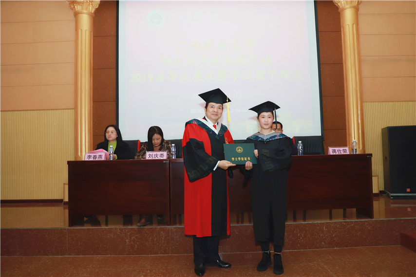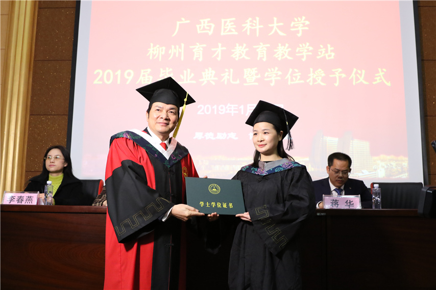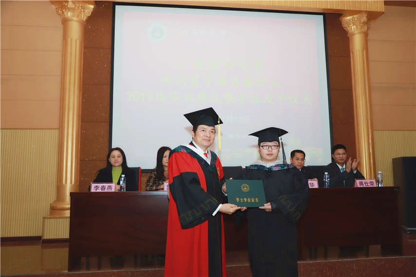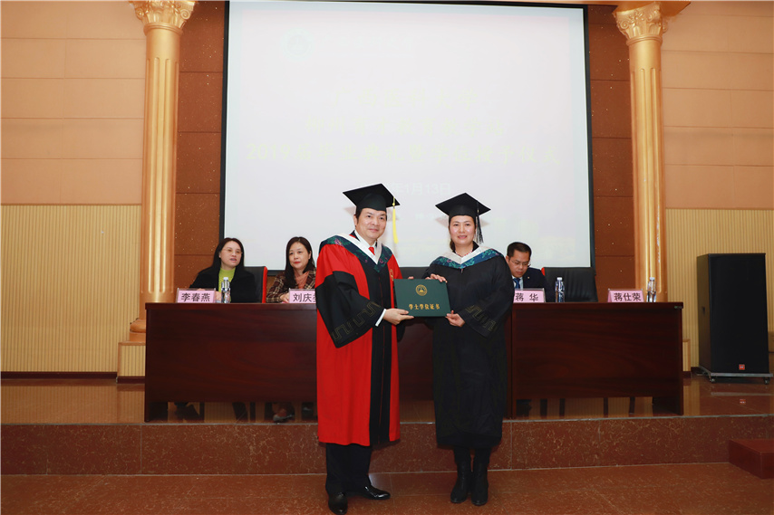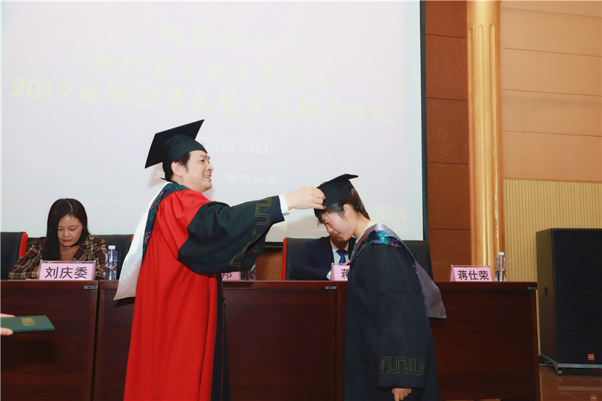 典禮上,劉慶委副院長宣讀2019屆繼續(xù)教育優(yōu)秀畢業(yè)生表彰決定和名單;李春燕副院長宣讀授予2019屆繼續(xù)教育學士學位文件和學士名單。廣西醫(yī)科大學繼續(xù)教育學院院長趙邦教授、副院長劉慶委、李春燕、教學站站長蔣華、副站長蔣仕榮共同為優(yōu)秀畢業(yè)生代表頒發(fā)榮譽證書,為畢業(yè)生代表頒發(fā)畢業(yè)證書。廣西醫(yī)科大學繼續(xù)教育學院院長、學位評定委員會委員趙邦教授為獲得學士學位的學生代表授予學位證書、撥穗正冠。