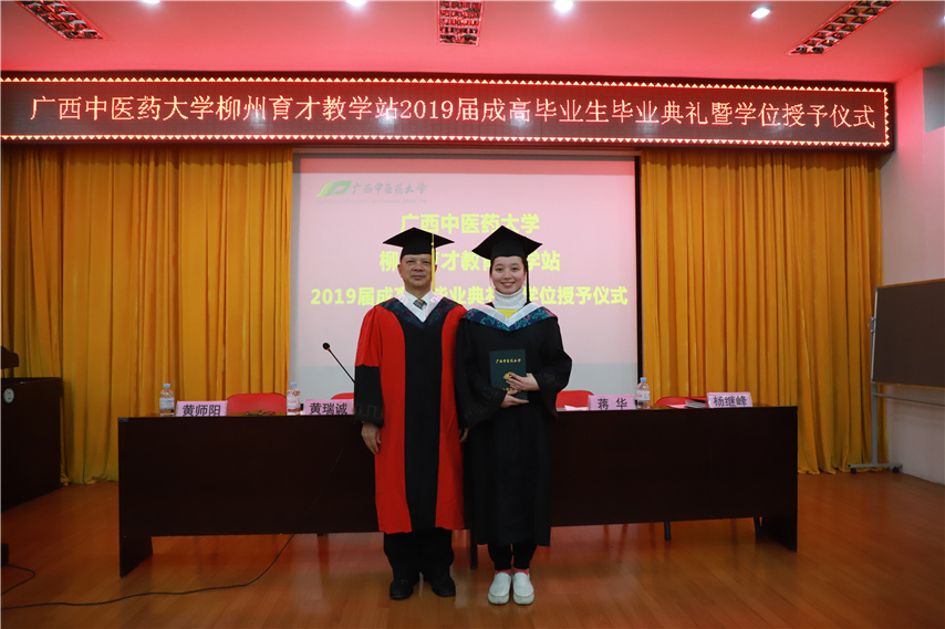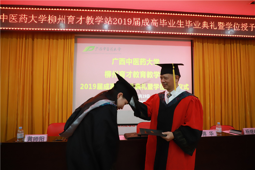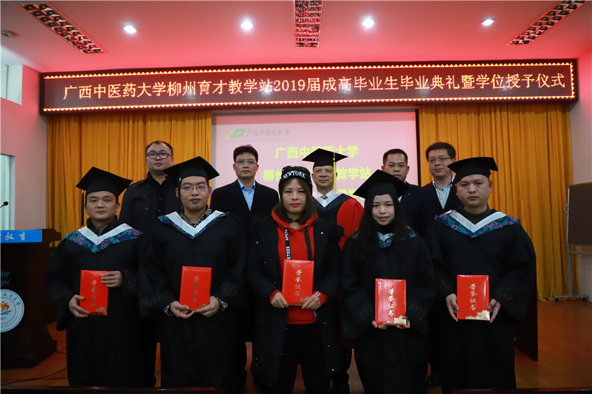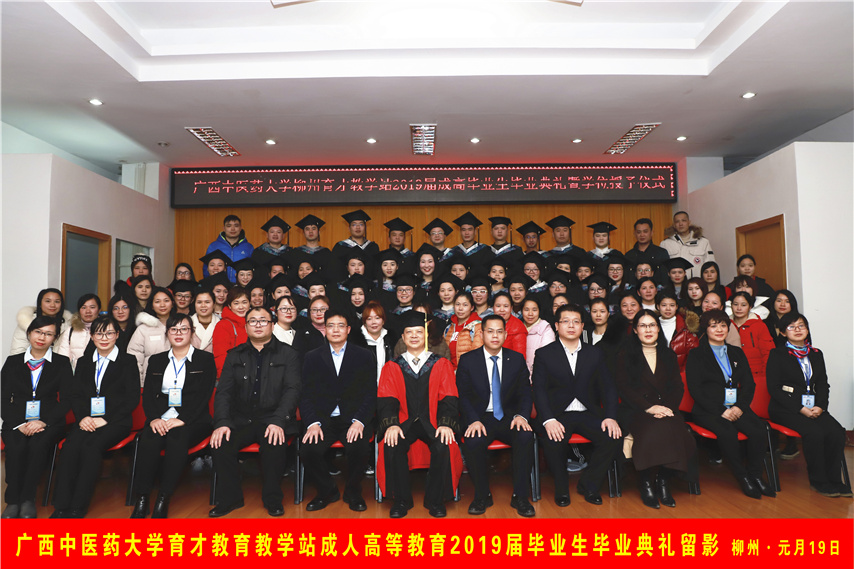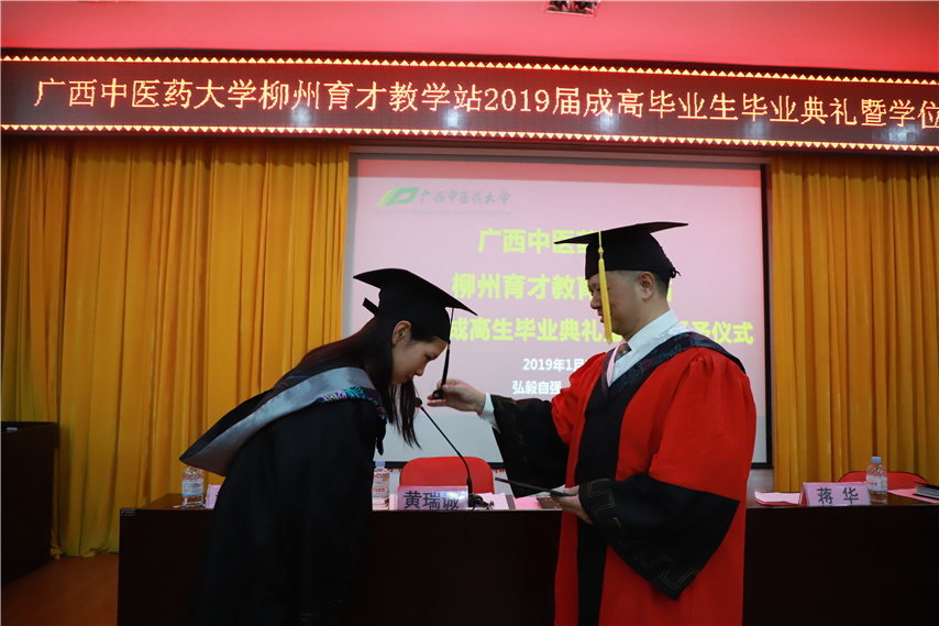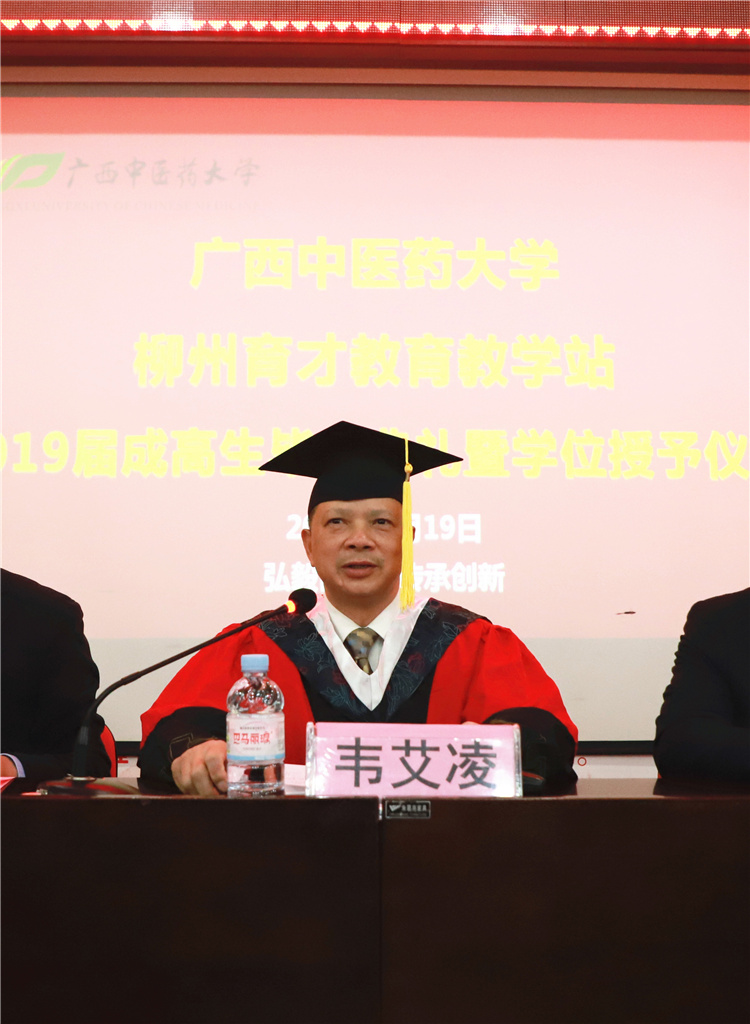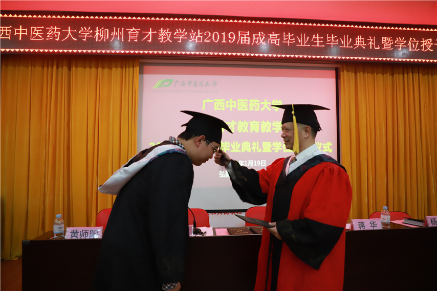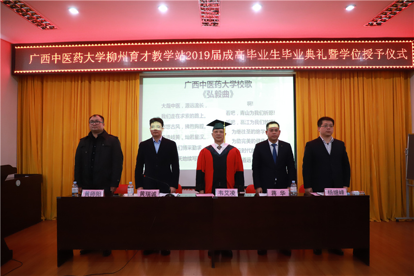 1月19日下午,廣西中醫(yī)藥大學(xué)柳州育才教學(xué)站2019屆成高畢業(yè)典禮暨學(xué)位授予儀式在柳州市中醫(yī)院隆重舉行。廣西中醫(yī)藥大學(xué)成人繼續(xù)教育學(xué)院院長(zhǎng)、博士生導(dǎo)師、二級(jí)教授韋艾凌、副院長(zhǎng)黃瑞誠(chéng)、學(xué)院培訓(xùn)中心主任楊繼峰、招生科科長(zhǎng)黃師陽(yáng)、育才黨總支書記、教學(xué)站站長(zhǎng)蔣華、副站長(zhǎng)李彩梅以及來自柳州醫(yī)學(xué)行業(yè)的100多名專本科畢業(yè)生代表參加了畢業(yè)典禮。會(huì)議由黃瑞誠(chéng)副院長(zhǎng)主持。