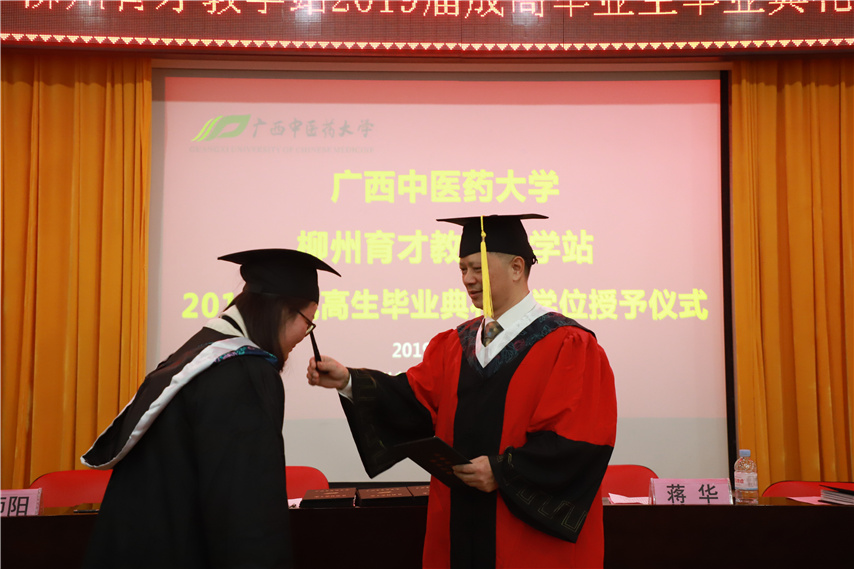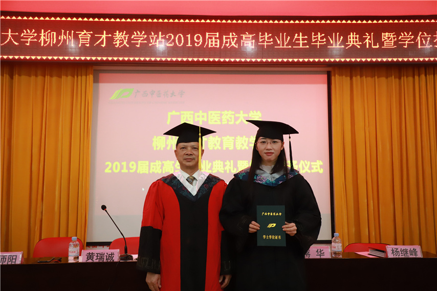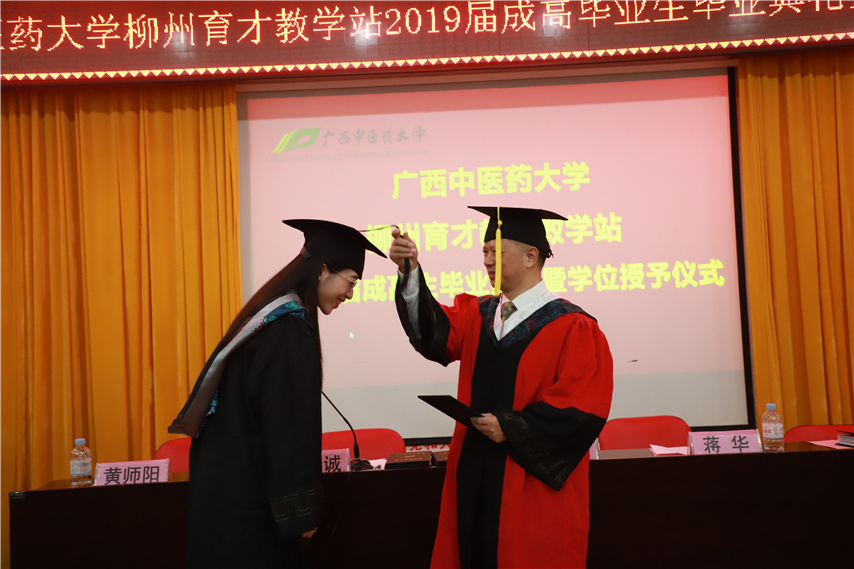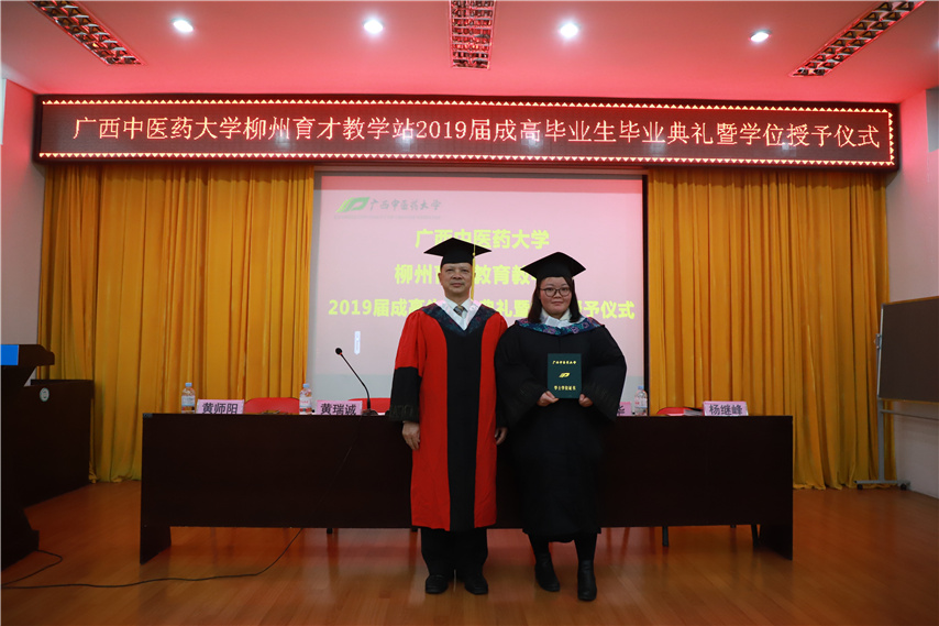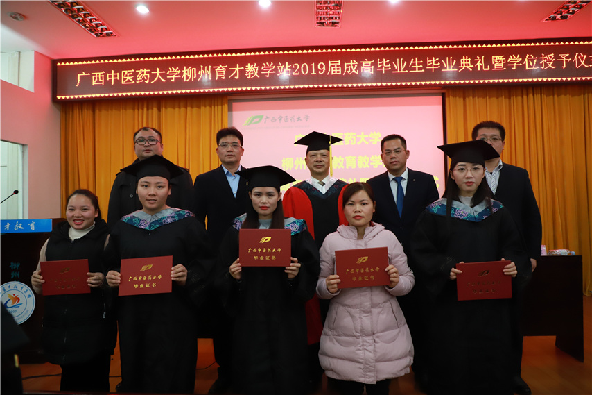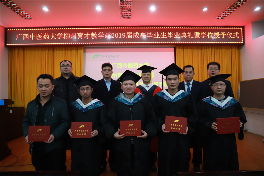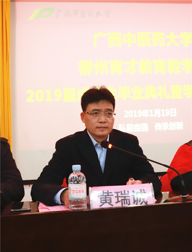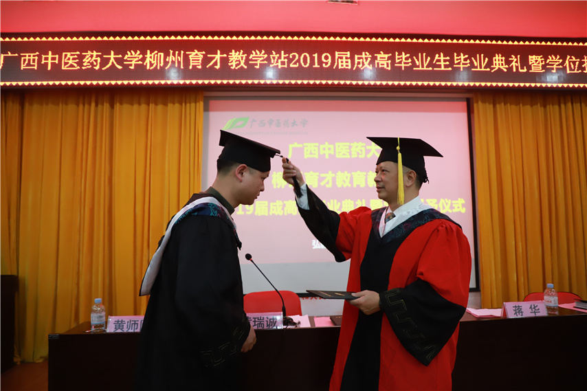 1月19日下午,廣西中醫(yī)藥大學(xué)柳州育才教學(xué)站2019屆成高畢業(yè)典禮暨學(xué)位授予儀式在柳州市中醫(yī)院隆重舉行。廣西中醫(yī)藥大學(xué)成人繼續(xù)教育學(xué)院院長(zhǎng)、博士生導(dǎo)師、二級(jí)教授韋艾凌、副院長(zhǎng)黃瑞誠(chéng)、學(xué)院培訓(xùn)中心主任楊繼峰、招生科科長(zhǎng)黃師陽(yáng)、育才黨總支書記、教學(xué)站站長(zhǎng)蔣華、副站長(zhǎng)李彩梅以及來自柳州醫(yī)學(xué)行業(yè)的100多名專本科畢業(yè)生代表參加了畢業(yè)典禮。會(huì)議由黃瑞誠(chéng)副院長(zhǎng)主持。