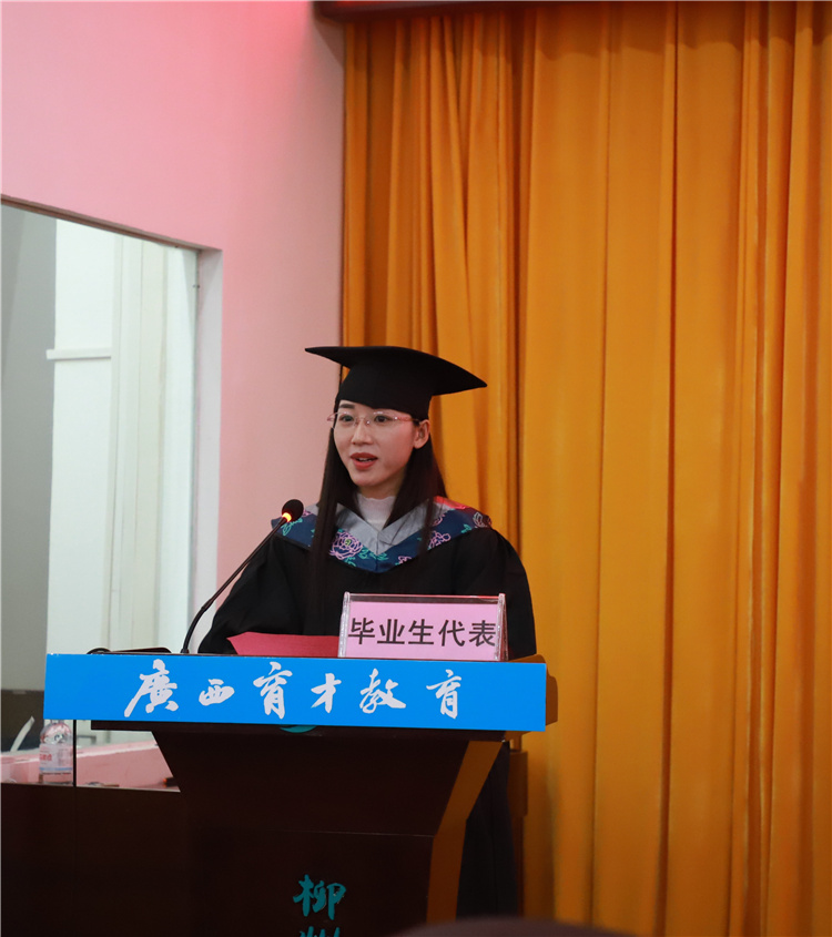 2016級(jí)護(hù)理學(xué)本科專業(yè)、來自柳州市中醫(yī)醫(yī)院的吳蘭婷作為畢業(yè)生代表,在發(fā)言中表達(dá)了對(duì)母校、對(duì)老師、對(duì)同窗的感恩之情,她說,畢業(yè)并不代表結(jié)束,而是宣布進(jìn)步,今后要不斷學(xué)習(xí),努力創(chuàng)造,填好人生的履歷表,為母校增輝添彩。