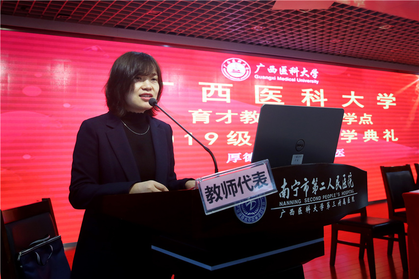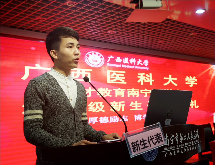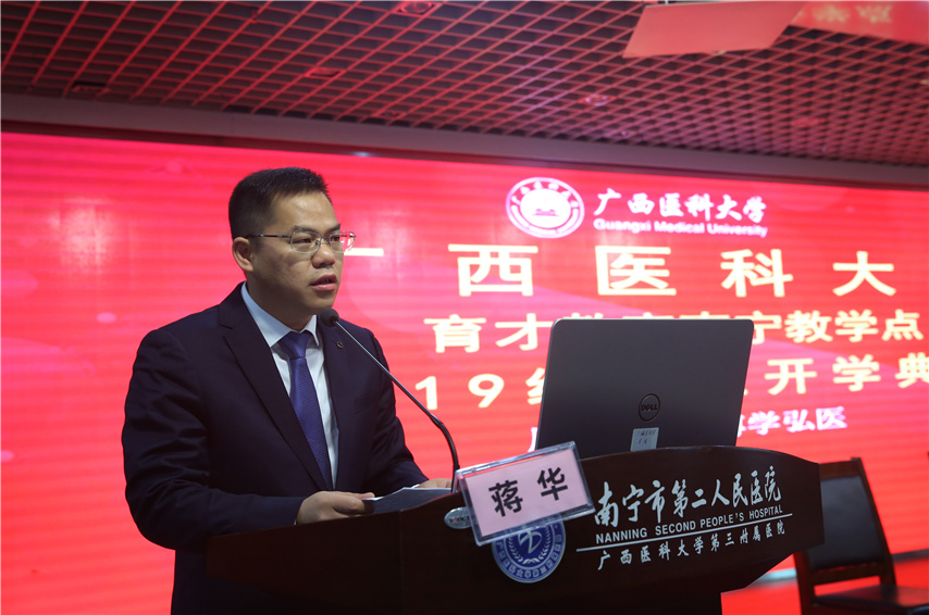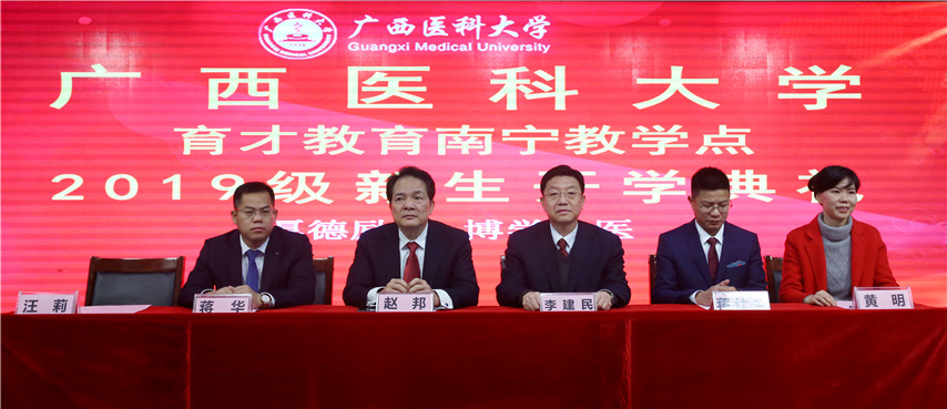 趙邦院長代表廣西醫(yī)科大學繼續(xù)教育學院,向2019級新生表示熱烈的歡迎和衷心的祝賀!向辛勤耕耘、艱辛付出的廣西育才教育教學點的各位領(lǐng)導和教職工致以誠摯的感謝!趙院長向新同學介紹了我校辦學歷史基本情況,并提出了三點殷切期望:一要厚德勵志,博學弘醫(yī)。要牢記校訓,踐行校訓,嚴格要求自己,掌握精湛醫(yī)術(shù),“修德修身,醫(yī)國醫(yī)人”,不斷升華精神境界,發(fā)揚白求恩救死扶傷的精神,立志做新時代的南丁格爾,成為一名醫(yī)術(shù)精湛、醫(yī)德高尚的醫(yī)務(wù)工作者。二要不忘初心,行穩(wěn)致遠。要不忘初心,主動適應,轉(zhuǎn)變意識,轉(zhuǎn)換角色,遵守教學點的紀律和規(guī)定,做到工作、學習“兩不誤,雙促進”,實現(xiàn)人生規(guī)劃“彎道超越”。三要追夢前行,壯美人生。要腳踏實地,用心治學,為天天學習“打卡”,揮灑汗水奮力拼,共圓人生夢想。