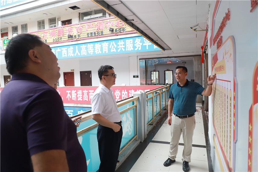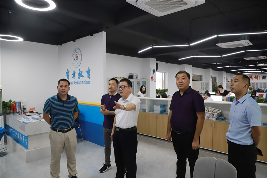 ▲廣西理工職業(yè)技術(shù)學(xué)院副院長黃日木(中)、繼續(xù)教育學(xué)院院長盛丹(右二)參觀育才辦學(xué)環(huán)境