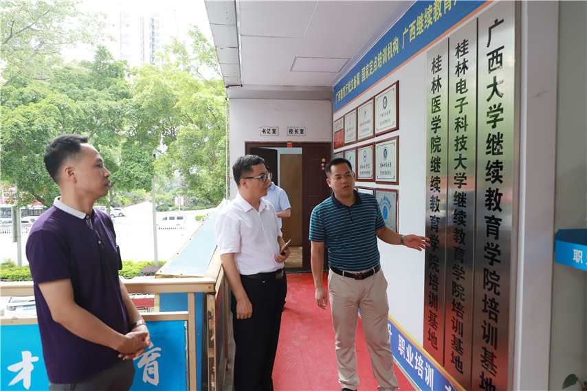 ▲廣西理工職業(yè)技術(shù)學(xué)院副院長黃日木(右二)、繼續(xù)教育學(xué)院院長盛丹(左一)參觀育才辦學(xué)環(huán)境
