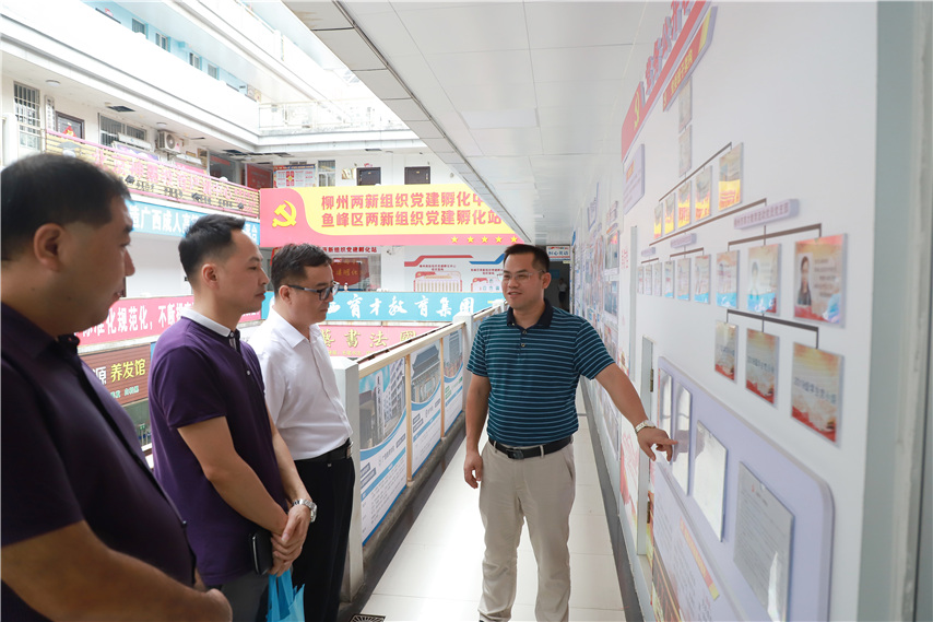 ▲廣西理工職業(yè)技術(shù)學(xué)院副院長黃日木(右二)、繼續(xù)教育學(xué)院院長盛丹(左二)參觀孵化站建設(shè)