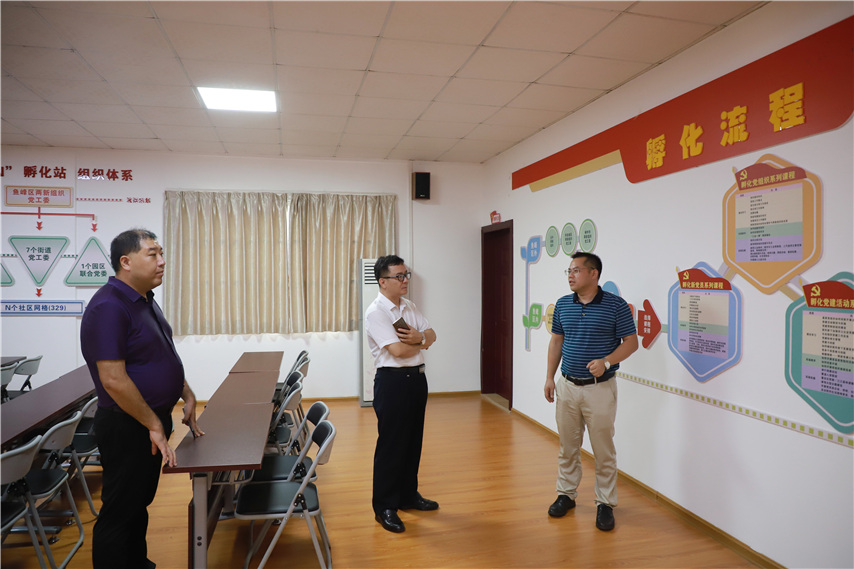 ▲廣西理工職業(yè)技術(shù)學(xué)院副院長黃日木(中)、繼續(xù)教育學(xué)院院長盛丹(左一)參觀孵化站建設(shè)