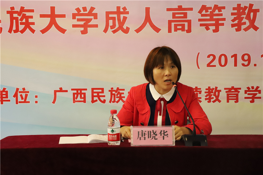▲廣西民族大學(xué)繼續(xù)教育學(xué)院副院長唐曉華主持會議