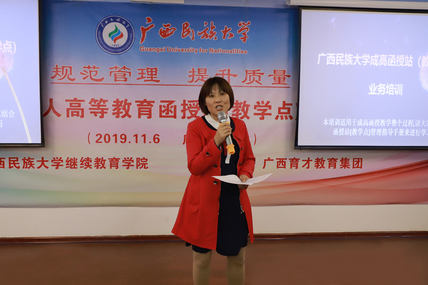 會上,廣西民族大學(xué)繼續(xù)教育學(xué)院柳州育才教育函授站站長蔣華代表集團全體職工對各位與會代表的到來表示熱烈歡迎,同時感謝廣西民族大學(xué)各位領(lǐng)導(dǎo)老師和兄弟單位的信任,讓育才在承辦本次會議的過程中又多了一次學(xué)習(xí)和提升的機會。
