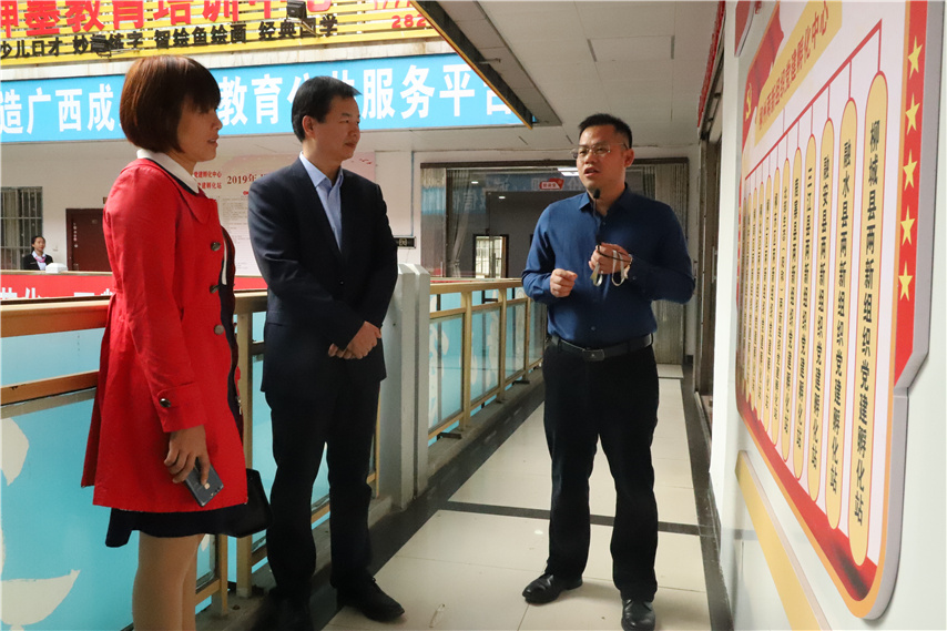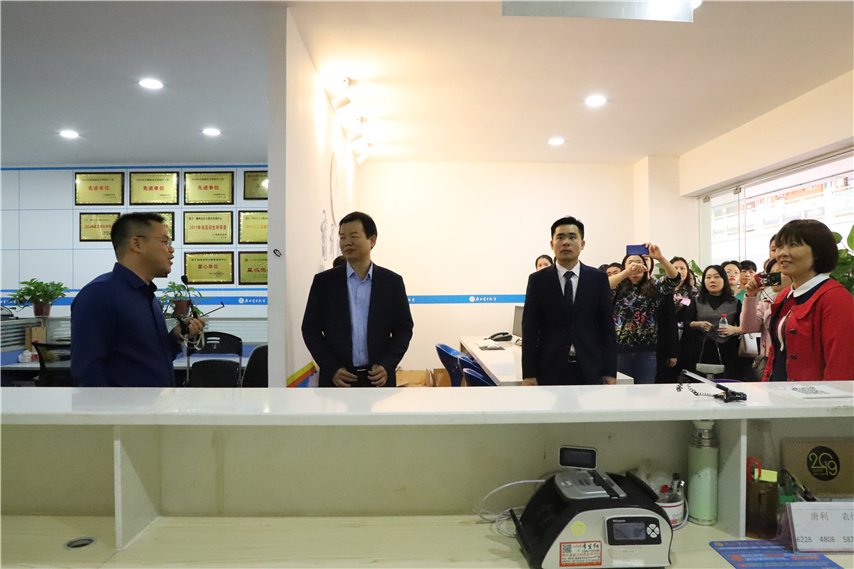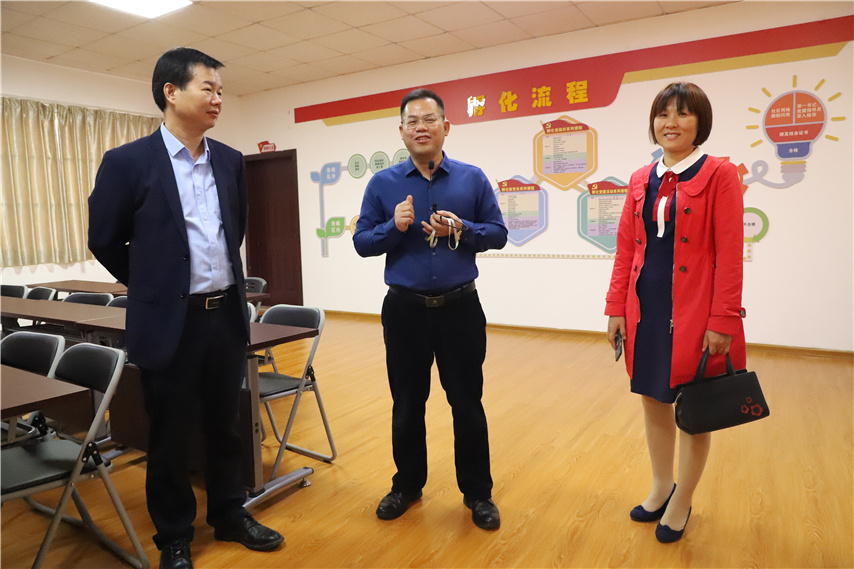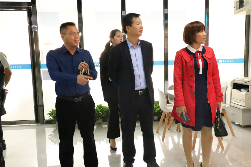 ▲覃志和院長(中)和唐曉華副院長(左一)了解黨建孵化中心架構(gòu)