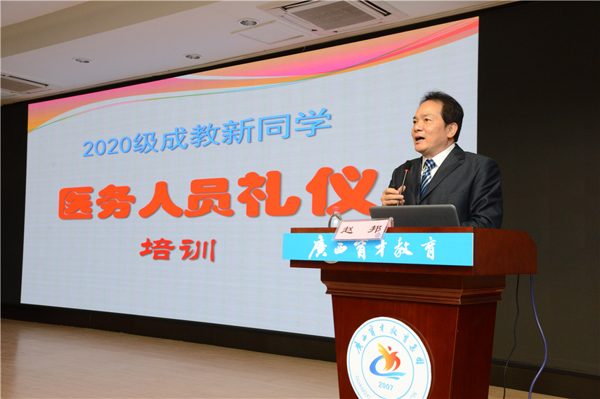 ▲廣西醫(yī)科大學(xué)繼續(xù)教育學(xué)院院長趙邦教授作禮儀培訓(xùn)
