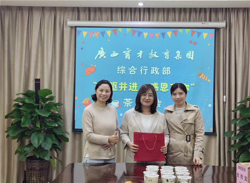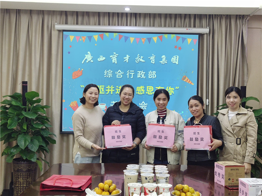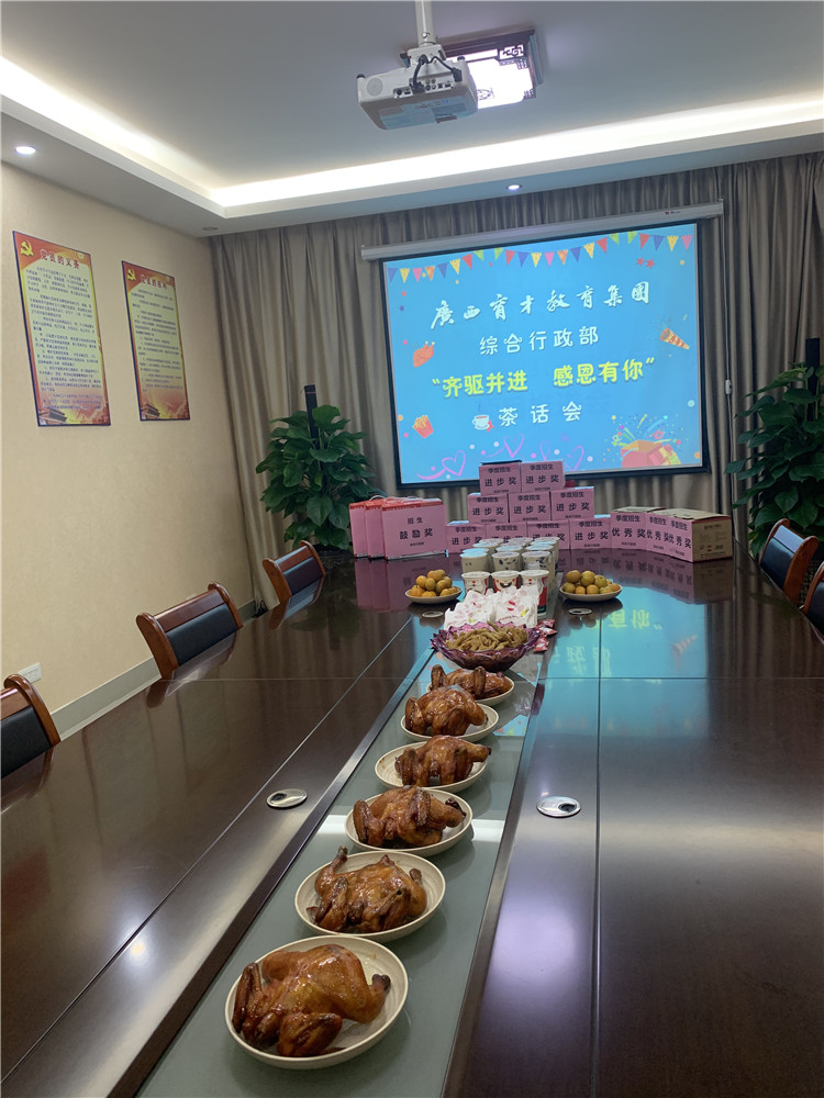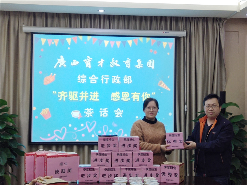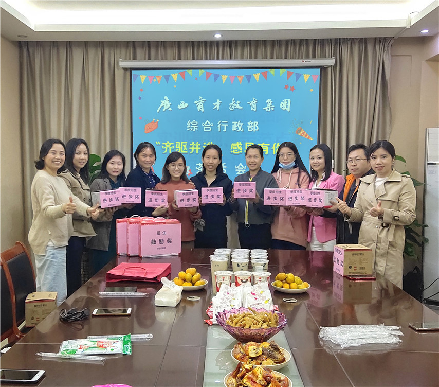 4月22日,綜合行政部“齊驅(qū)并進 感恩有你”茶話會在柳州本部舉行,集團聯(lián)合黨委委員、副總經(jīng)理王麗,綜合行政部部長蔣麗平等綜合行政部職工參加了茶話會。會上,美食相伴,更有驚喜獎品,對在第一季度招生工作中表現(xiàn)優(yōu)秀的職工進行了表彰,以資鼓勵,在歡聲笑語中相互分享了招生經(jīng)驗。同時,也為近期加入綜合行政部的伙伴送上精美禮品。