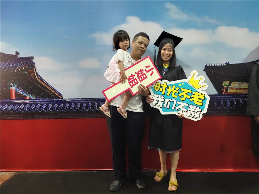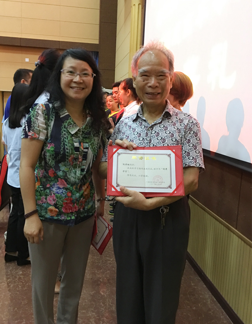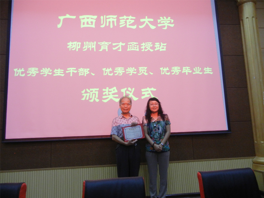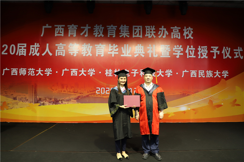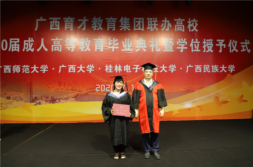 ▲2017年7月,廣西師范大學(xué)柳州育才函授站畢業(yè)典禮上,廣西師范大學(xué)繼續(xù)教育學(xué)院院長(zhǎng)、博士劉玉紅教授為阮學(xué)林頒發(fā)??飘厴I(yè)證書并合影