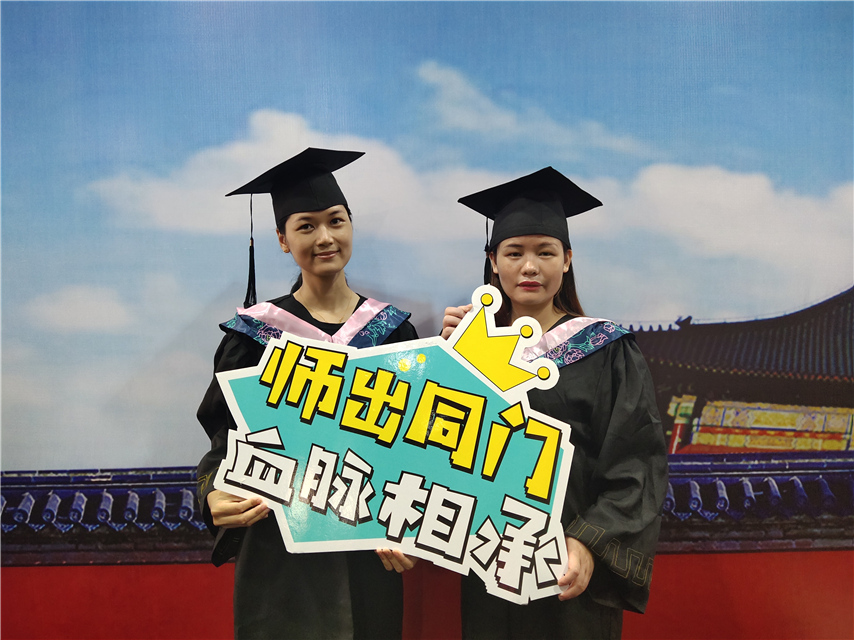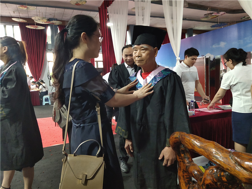 ▲集團(tuán)聯(lián)合黨委委員、副校長(zhǎng)李彩梅為阮學(xué)林整理學(xué)士服
