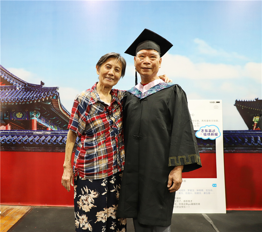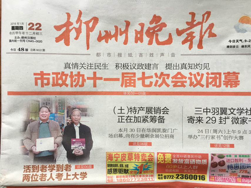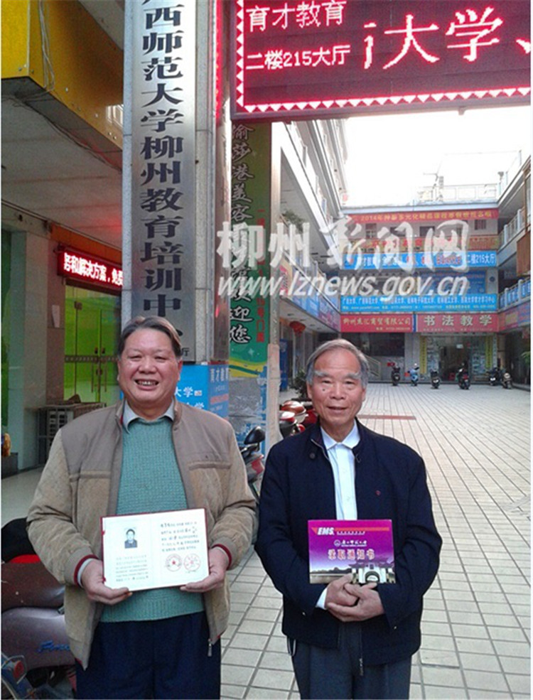 ▲2015年1月,阮學(xué)林和潘景春兩位老人喜獲廣西師范大學(xué)成人高考錄取通知書