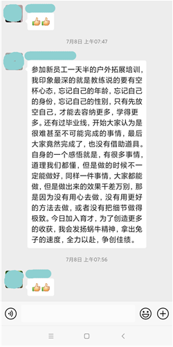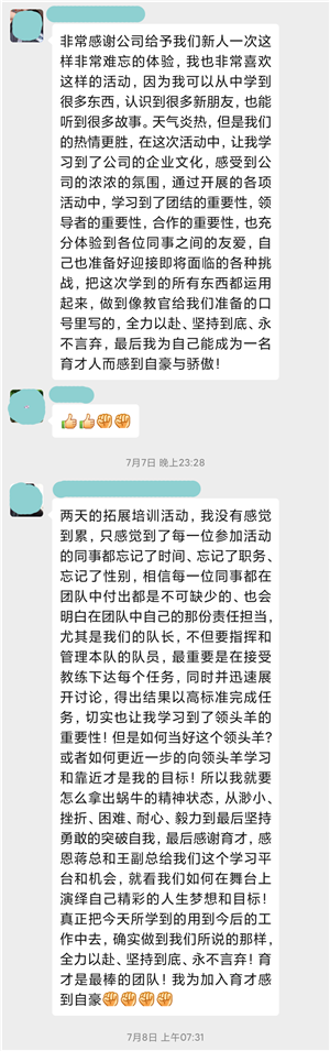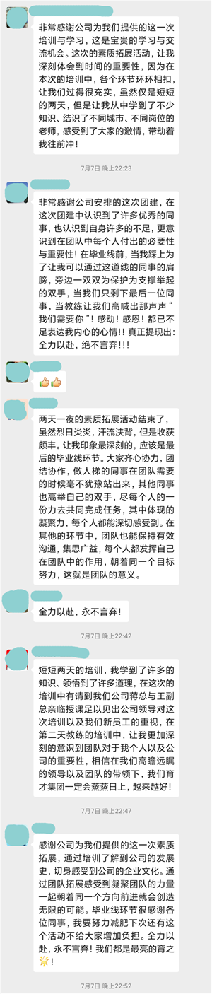 此次素質(zhì)拓展培訓(xùn)是公司探索員工培養(yǎng)方式的一次創(chuàng)新。通過兩天一夜的拓展培訓(xùn),化零為整,化整為零,所有人融合成一個大團隊,尤其將企業(yè)文化融入其中,每一個人感受到了這次培訓(xùn)形式新穎、內(nèi)容豐富,深刻理解團隊合作、溝通、執(zhí)行的重要性。在體驗著擔(dān)當(dāng)、奉獻、協(xié)作帶來的成功喜悅后,每個人都切身體會到“服務(wù)至上、共同成長、促進教育事業(yè)的發(fā)展”的企業(yè)使命和“誠信做事,做優(yōu)質(zhì)服務(wù);誠心做人,辦良心教育”的價值觀,表示在未來的工作崗位上,乘風(fēng)破浪,勇敢逐夢,譜寫自己亮麗的人生篇章。