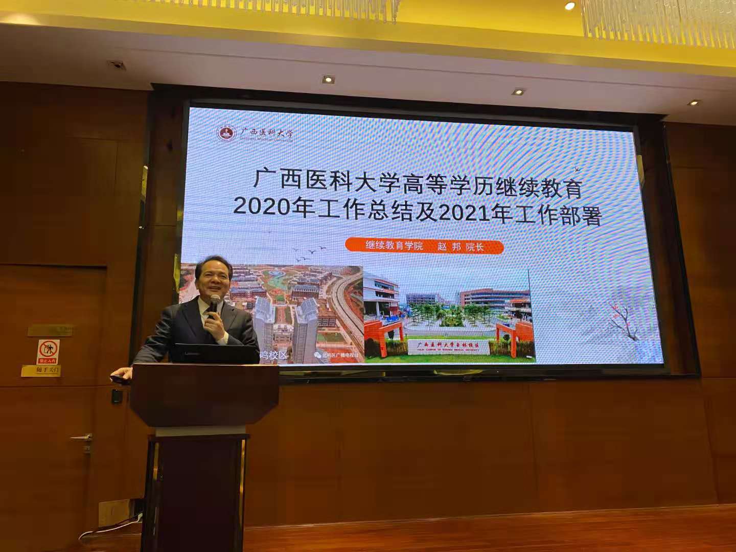 趙邦院長(zhǎng)總結(jié)回顧了廣西醫(yī)科大學(xué)高等學(xué)歷繼續(xù)教育2019年招生工作及2020年教學(xué)工作情況,部署了2020年招生工作及2021年教學(xué)工作。提出四點(diǎn)要求:一要堅(jiān)持規(guī)模發(fā)展,拓展招生市場(chǎng)渠道;二要加大工作力度,依規(guī)開(kāi)展招生;三要堅(jiān)持立德樹(shù)人,深化教育教學(xué)改革;四要堅(jiān)持有效解決工學(xué)這個(gè)矛盾不停步。