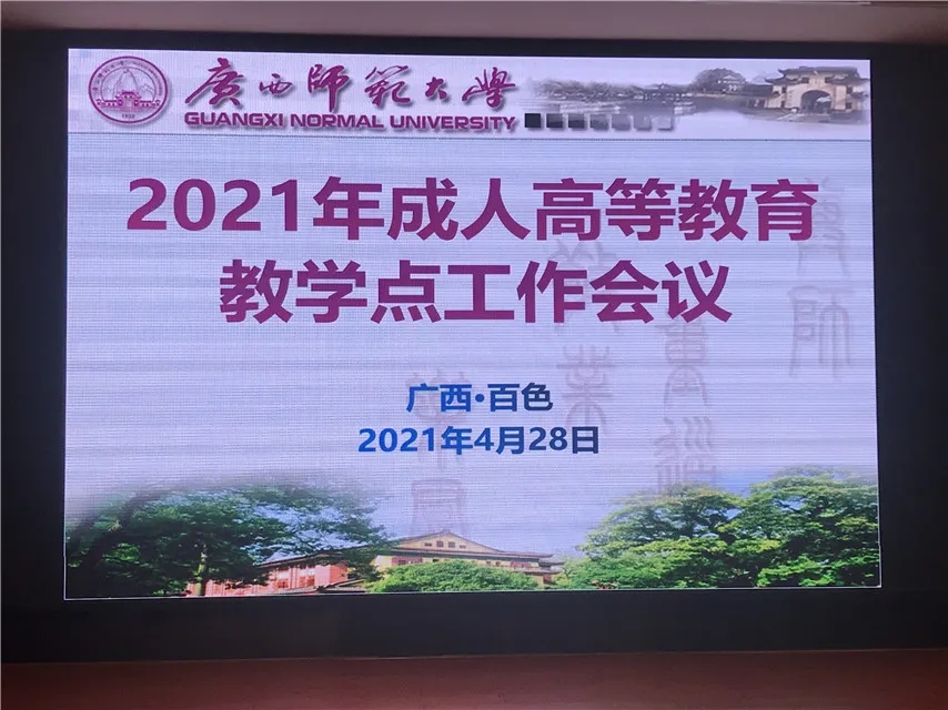 4月28日,廣西師范大學(xué)2021年成人高等教育教學(xué)點(diǎn)工作會(huì)議在百色順利召開(kāi),繼續(xù)教育學(xué)院院長(zhǎng)、博士生導(dǎo)師劉玉紅教授、副院長(zhǎng)何創(chuàng)雄、謝俊峰、李敏以及各成高教學(xué)點(diǎn)負(fù)責(zé)人共60余人參加了會(huì)議,會(huì)議由李敏副院長(zhǎng)主持,我函授站站長(zhǎng)蔣華參加了會(huì)議。