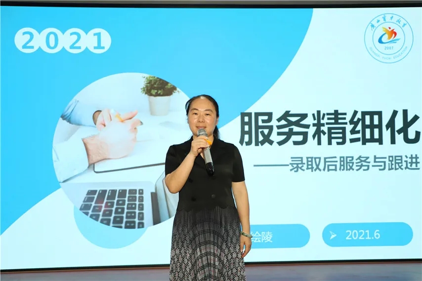 ▲高職擴(kuò)招部副部長(zhǎng)陳繪陵作《錄取后服務(wù)與跟進(jìn)》授課