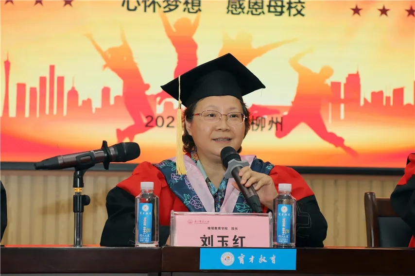 廣西師范大學(xué)繼續(xù)教育學(xué)院院長、博士生導(dǎo)師劉玉紅教授講話,她說,在疫情防控常態(tài)化的新形勢下,祝賀同學(xué)們都順利完成了學(xué)業(yè)。成人高考所獲得的學(xué)歷是屬于國民教育行列的文憑,是被國家和社會所承認(rèn)的。成人高考的學(xué)歷是經(jīng)過電子注冊的,是可以在國家學(xué)信網(wǎng)上查到的學(xué)歷。無論走到哪里,希望各位校友?;啬感?纯?。