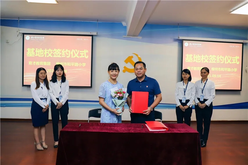 ▲集團(tuán)與柳州市和平路小學(xué)(代表小學(xué)學(xué)段)舉行基地校簽約儀式