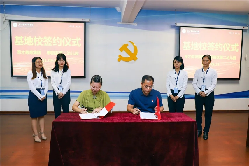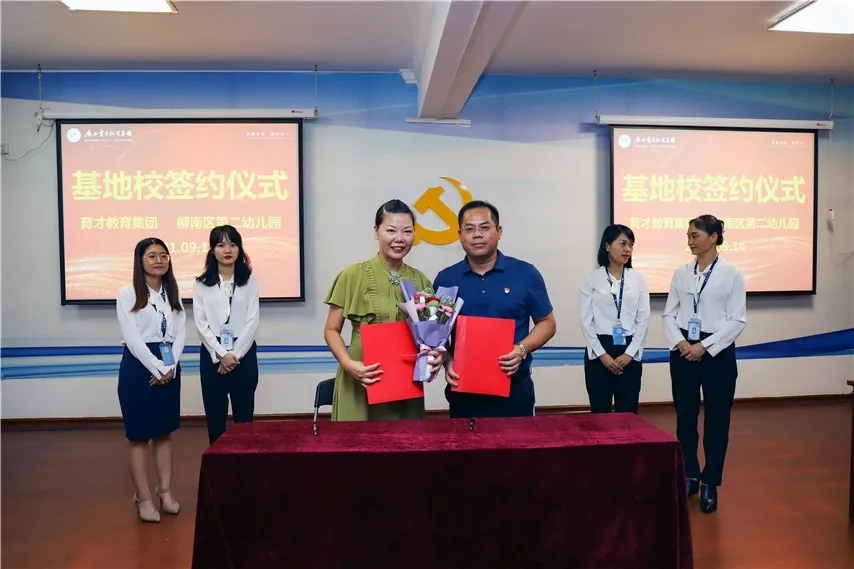 ▲集團(tuán)與柳南區(qū)第二幼兒園(代表學(xué)前段)舉行基地校簽約儀式